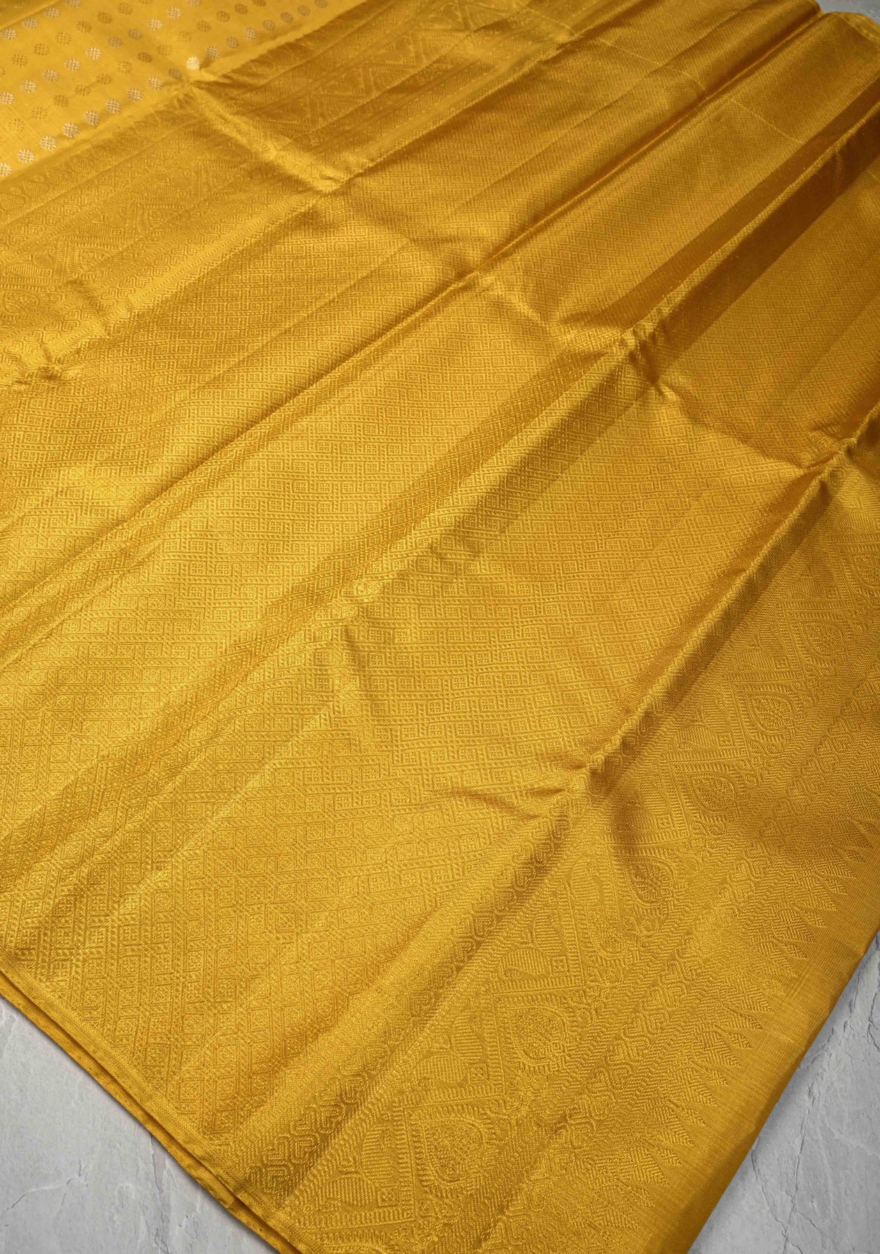 The Gold Kanjivaram Tissue Silk Saree with Sona Rupa Buttas and Distinct Mandala Motifs on the Border is an exquisite blend of opulence and traditional craftsmanship. The shimmering gold tissue silk fabric radiates elegance, while the intricate Sona Rupa buttas add a touch of luxury with their gold and silver zari work.