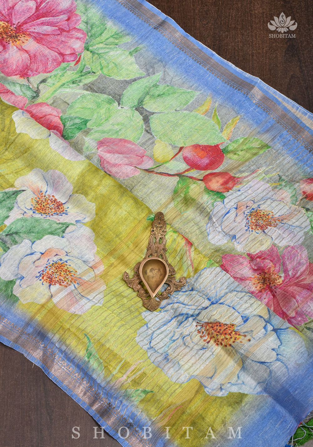 Dusty Sage Green Vegan Silk Viscose Tissue Saree with Printed Floral Pattern and Antique Gold Embroidery Scallop Border