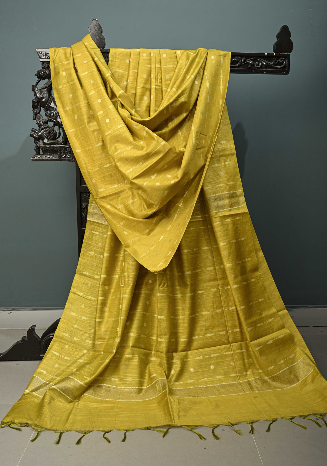 Moss Green Semi Tussar Saree with Muted Zari Buttas and Zari Borders