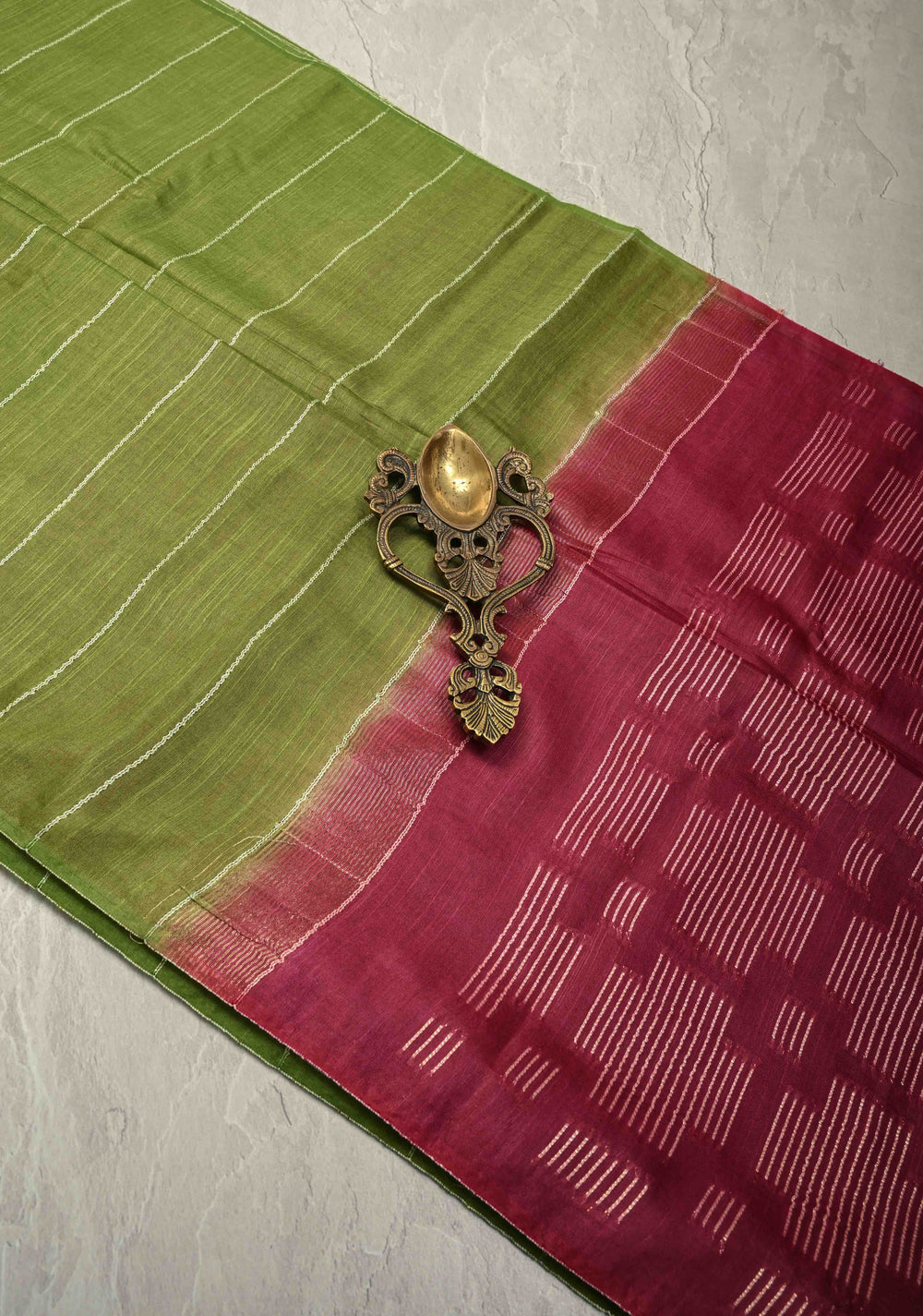 Henna Green Pure Gadwal Silk Saree with Horizontal Zari Stripes and Contrast Zari Border | SILK MARK CERTIFIED