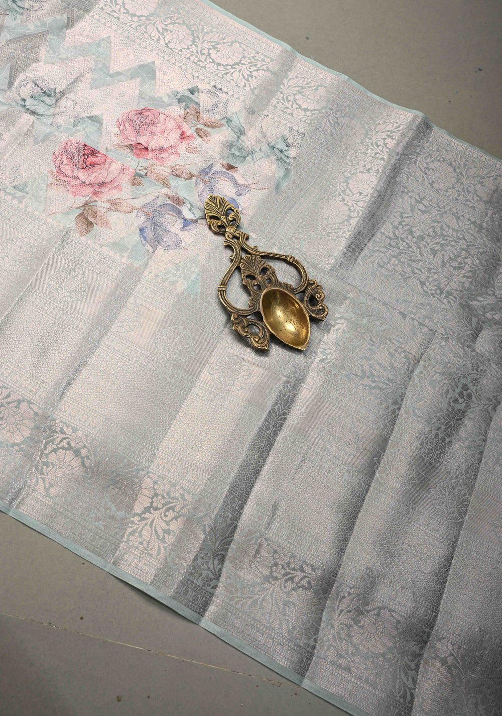 Pastel Sage Green Floral Digital Print on Banarasi Semi Silk Saree with Muted Zari Chevron Design and Wide Zari Border