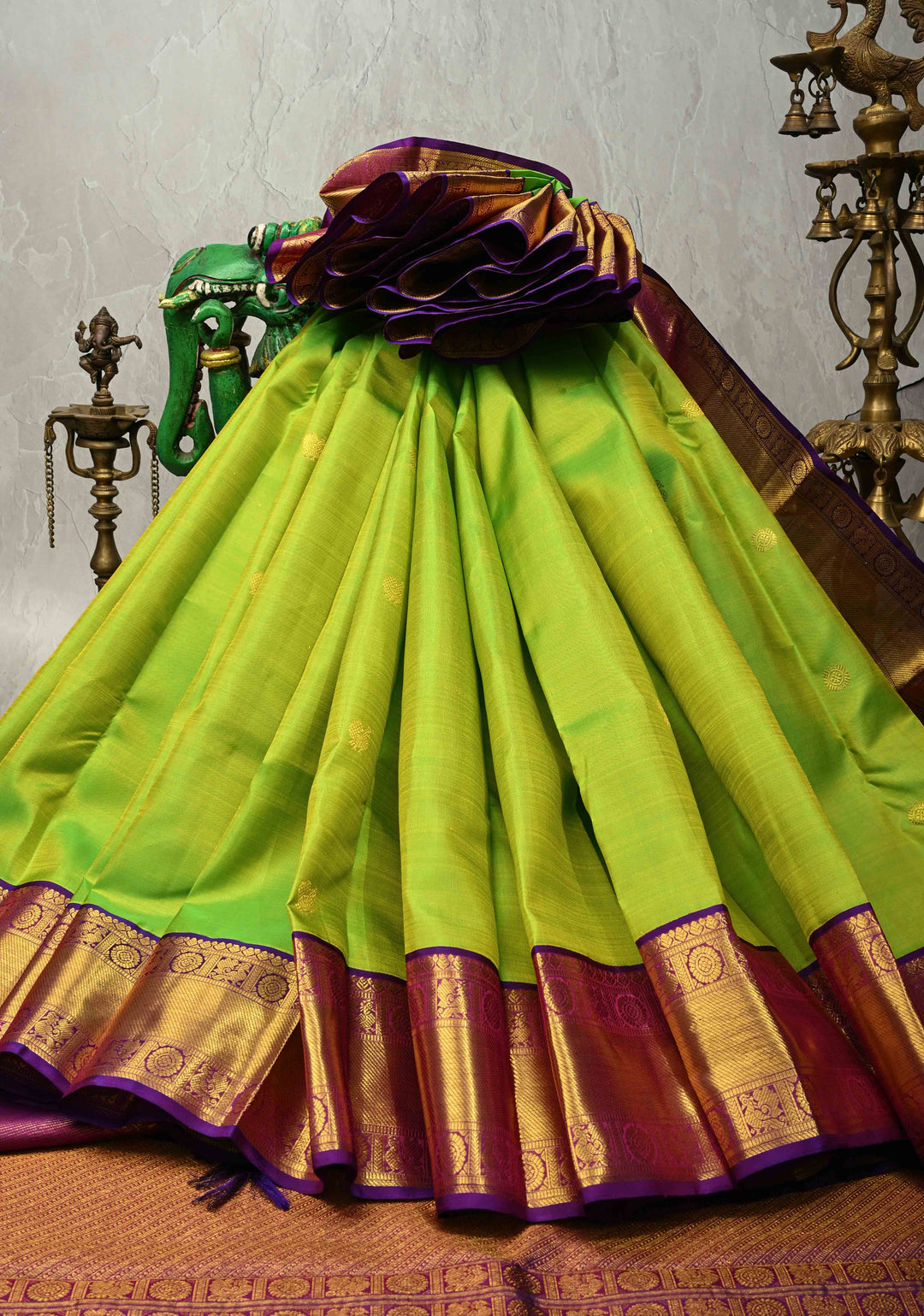 Lime Green Pure Kanjivaram Soft Silk Saree with Gold-Silver Floral Buttas and Rangkaat Style Border | SILK MARK CERTIFIED