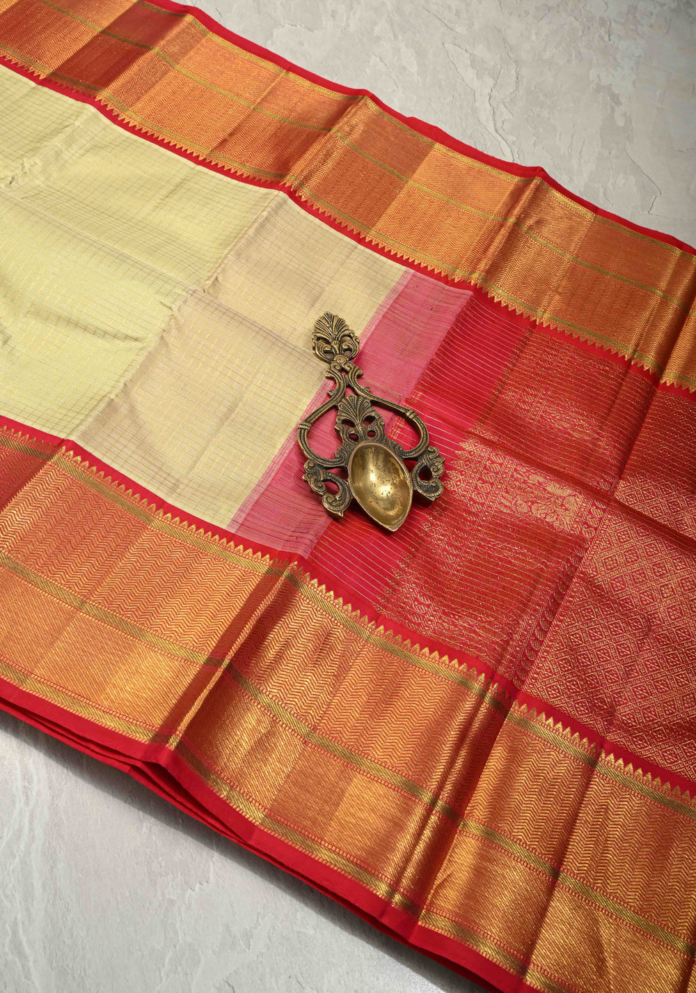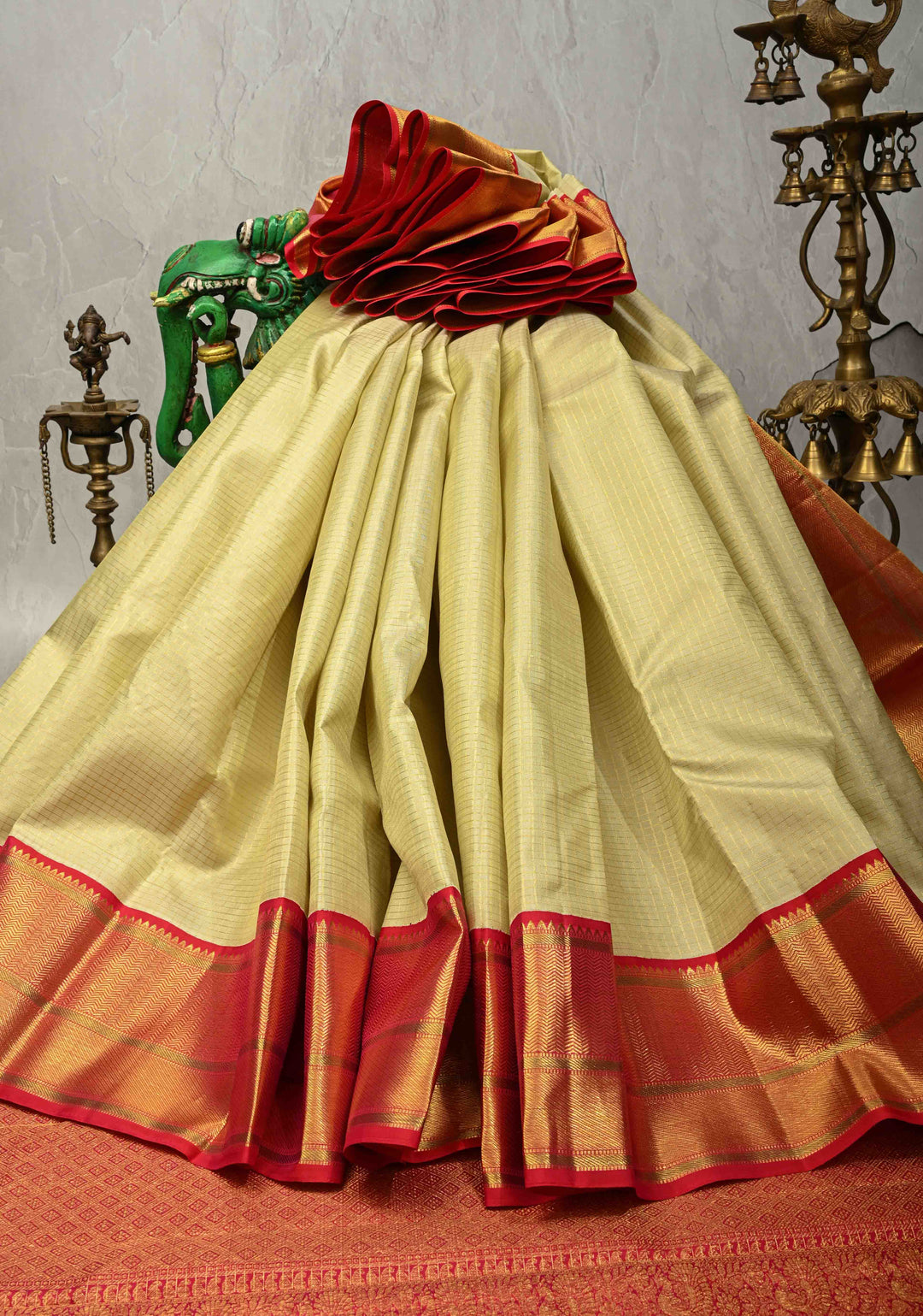 Pista Green Dual Tone korvai Kanjivaram Pure Silk Saree with Zari Checks and Contrast Wide Zari Border | SILK MARK CERTIFIED