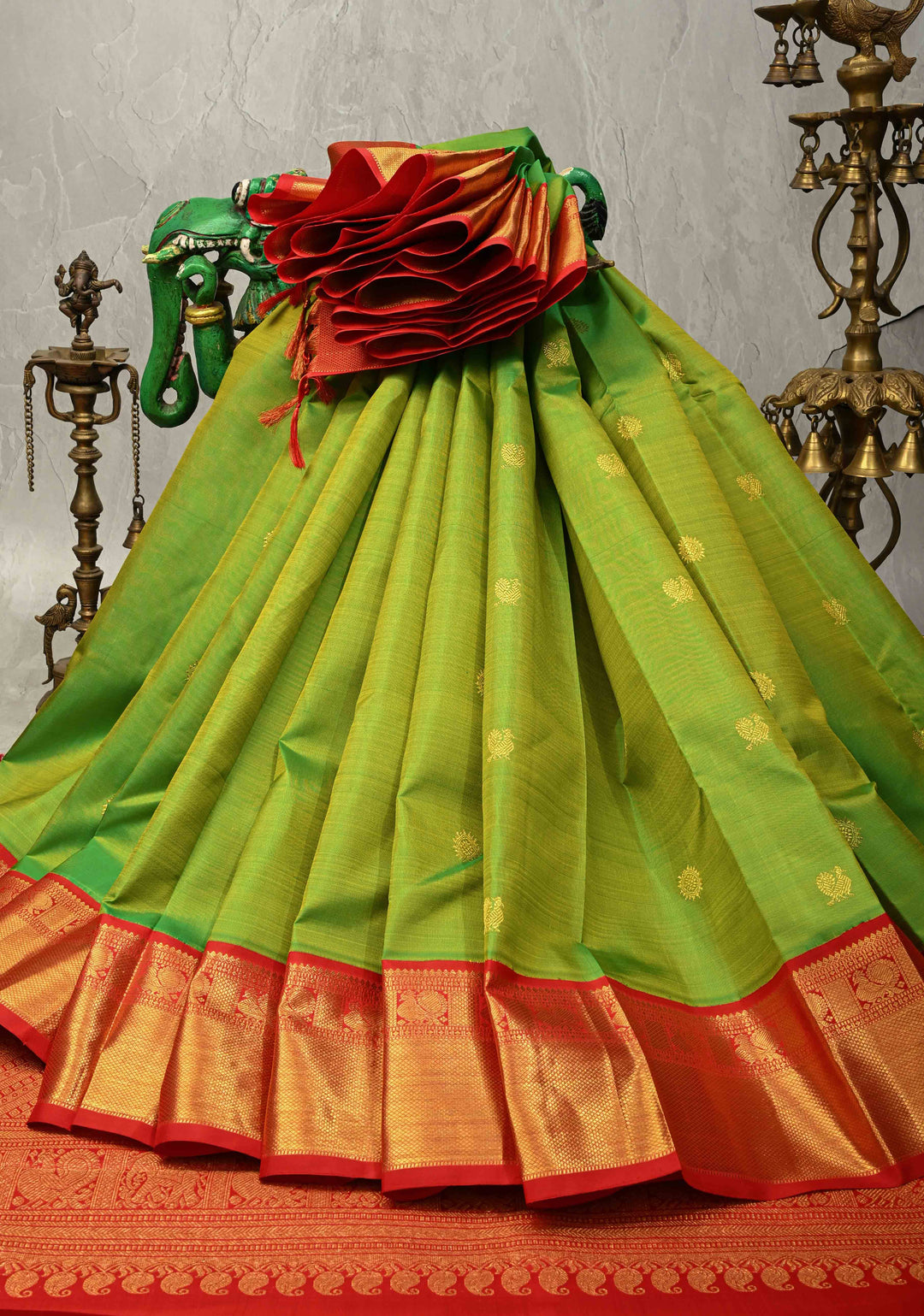 Methi Green Pure Kanjivaram Silk Saree with Zari Buttas and Contrast Ganga Jamuna Border | SILK MARK CERTIFIED