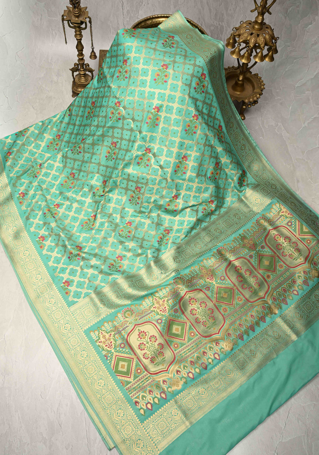 Mint Green Banarasi Silk Saree with Kadhuwa Sona Rupa Jungla weave and Meenakari Butta and Framed Border | SILK MARK CERTIFIED