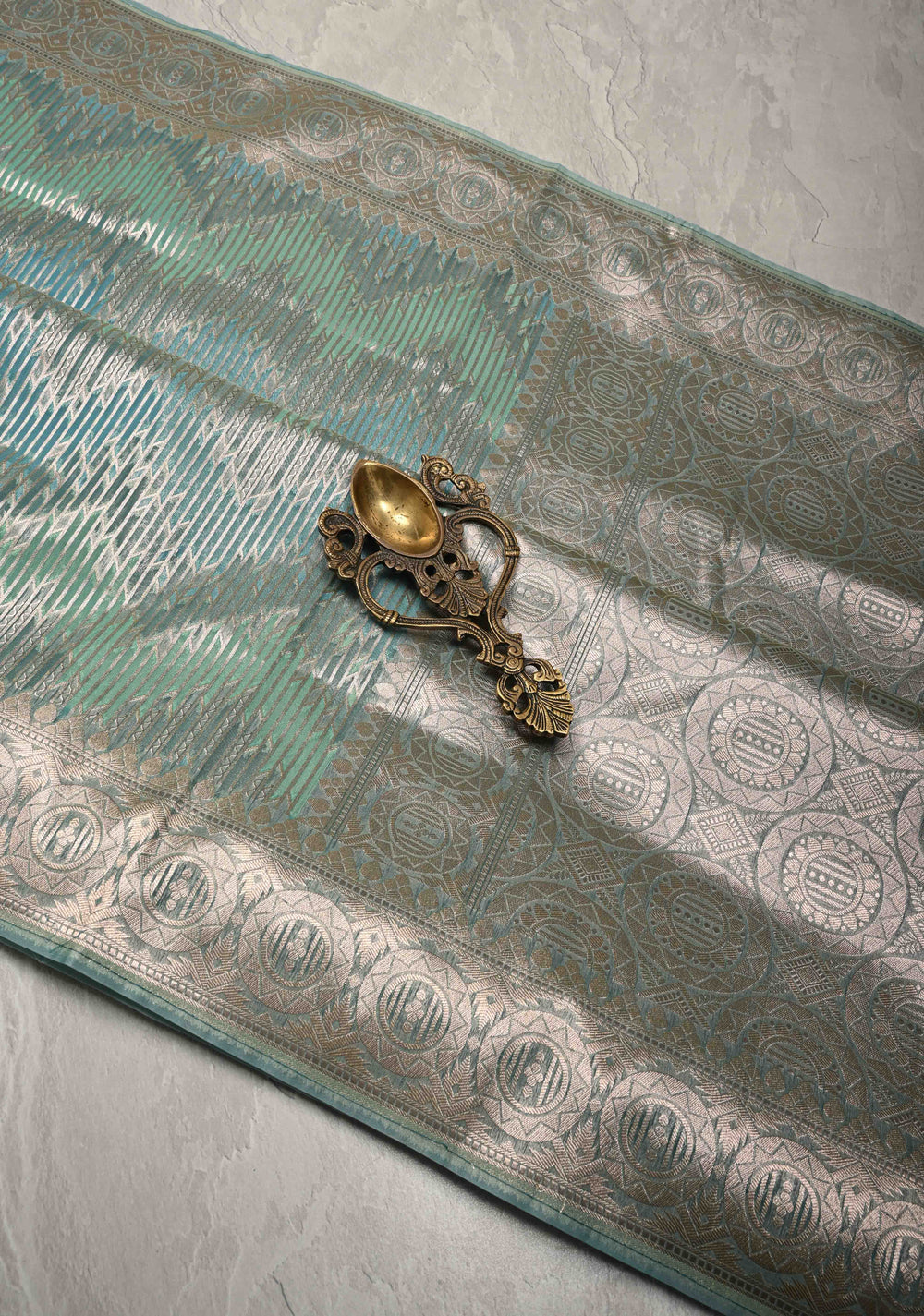Sage Green Banarasi Georgette Silk Saree with Morroccon Brocade Jaal and Zari Border | SILK MARK CERTIFIED