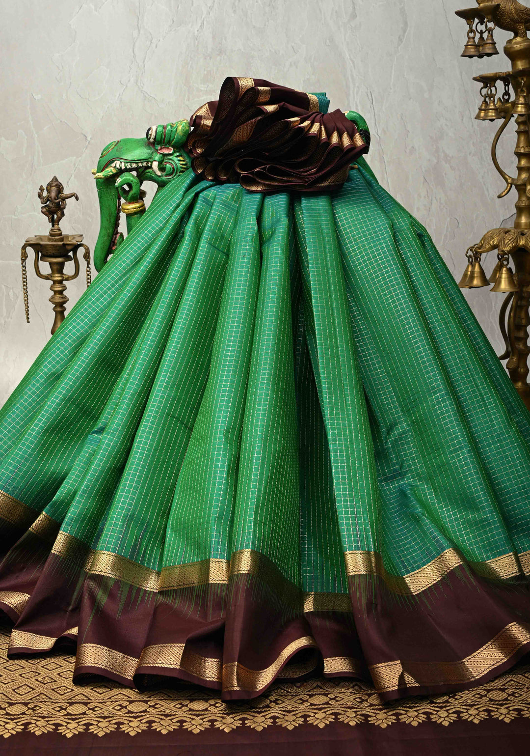 Rama Green Dual tone Podi-Kattam Zari Checks on Pure Kanjivaram Soft Silk Saree with Contrast Coffee Brown Rettiapet Zari Border | SILK MARK CERTIFIED