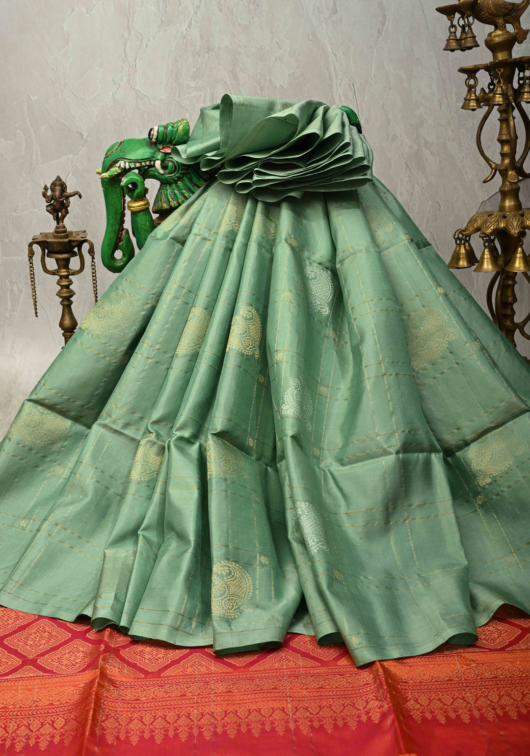 Sage Green Pure Kanjivaram Silk saree with Zari Buttas and Contrast Zari Border| SILK MARK CERTIFIED