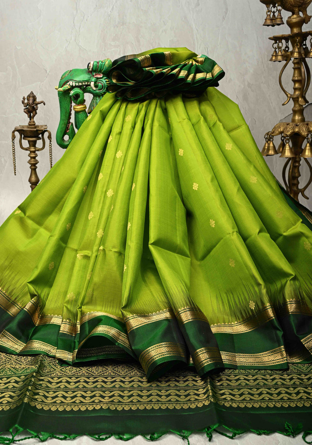 Lime Green Pure Kanjivaram Soft Silk Saree with Zari Buttas and Contrast Bottle Green Rettiapet Zari Border | SILK MARK CERTIFIED