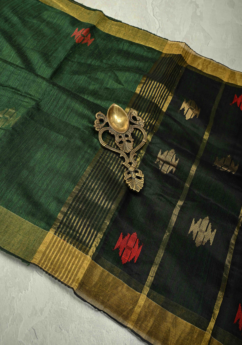 Green Gold Handloom Matka Silk Jamdani Saree with blouse Piece