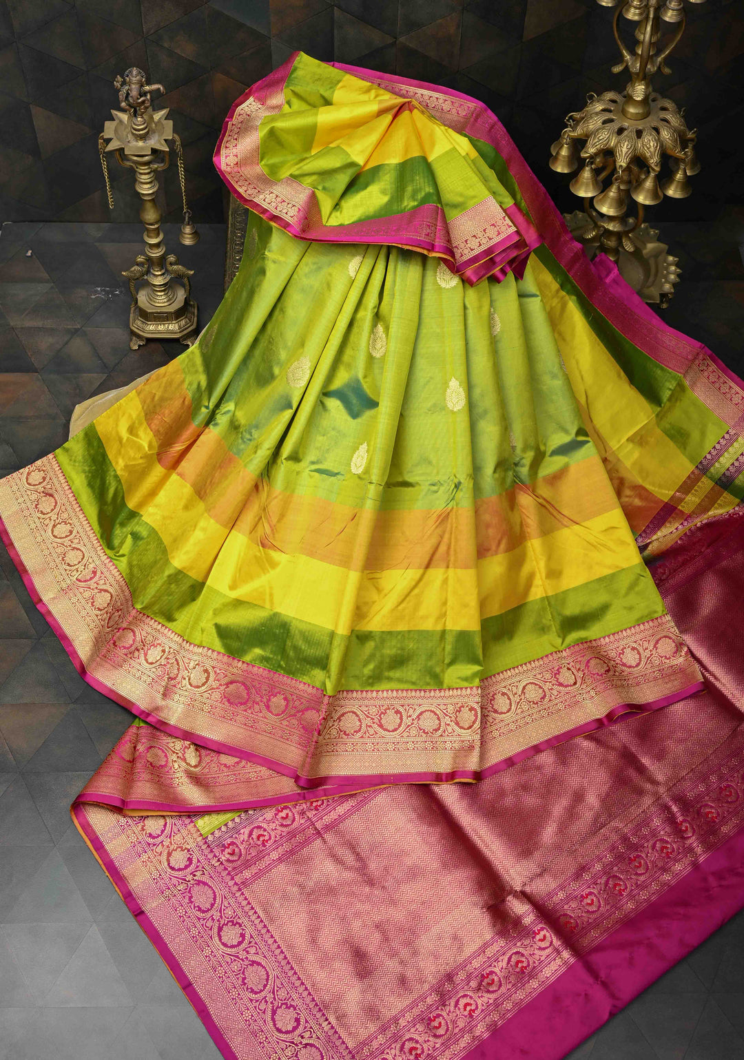 Chartreuse Mysore Silk Saree with Horizontal Zari Stripes and Contrast Zari Borders | SILK MARK CERTIFIED