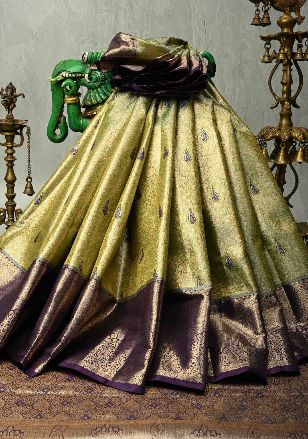 Pastel lime Green Kanjivaram Tissue Semi Silk Saree with Meenakari Floral Brocade Jaal and Contrast Wide Zari Border