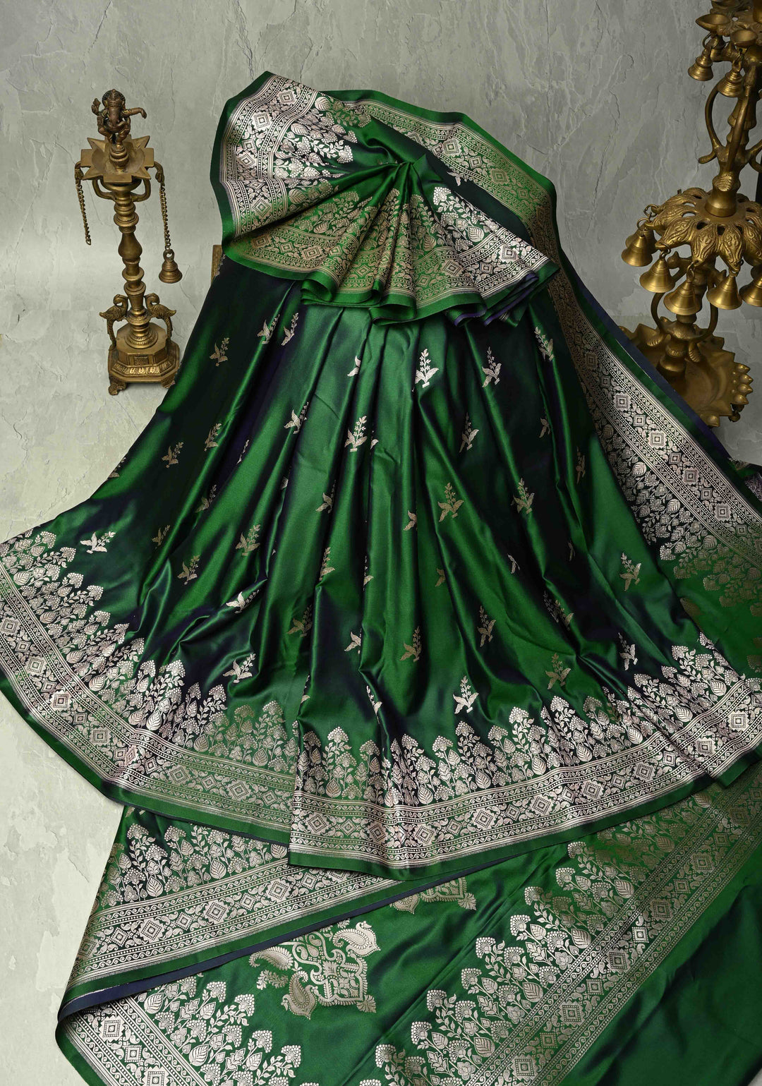 Bottle Green Banarasi Semi Mashru Silk Saree with Meenakari Floral Buttas and Silver Scallop Border