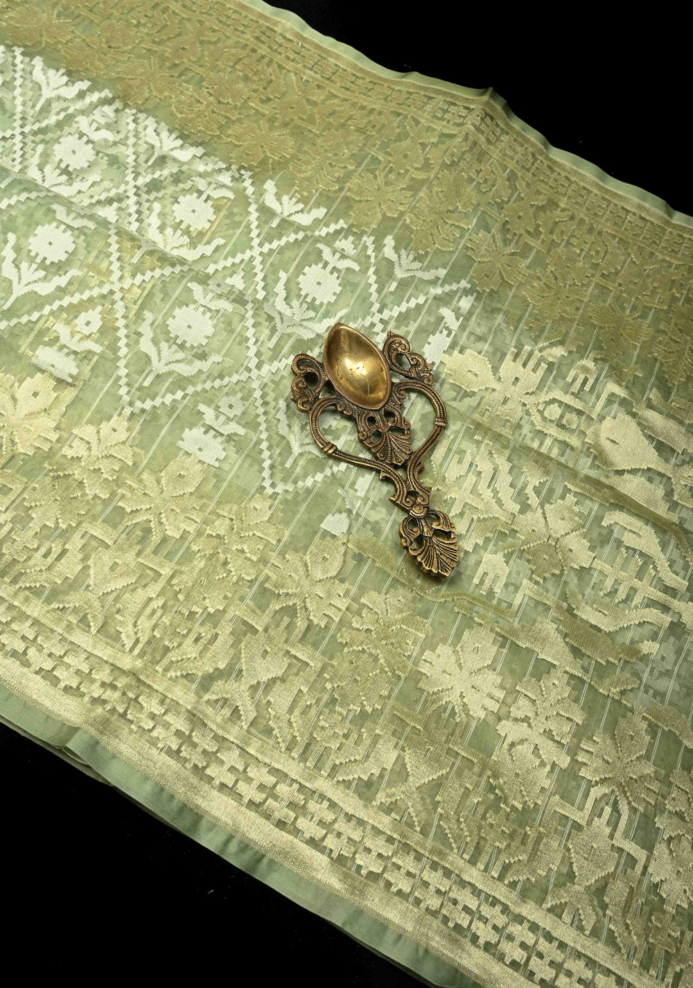 Pista Green Silk Muslin Saree with Resham Jamdani Weaving | SILK MARK CERTIFIED