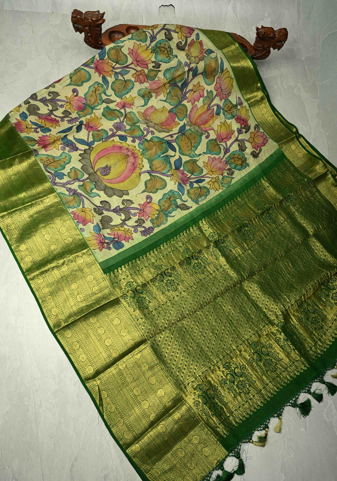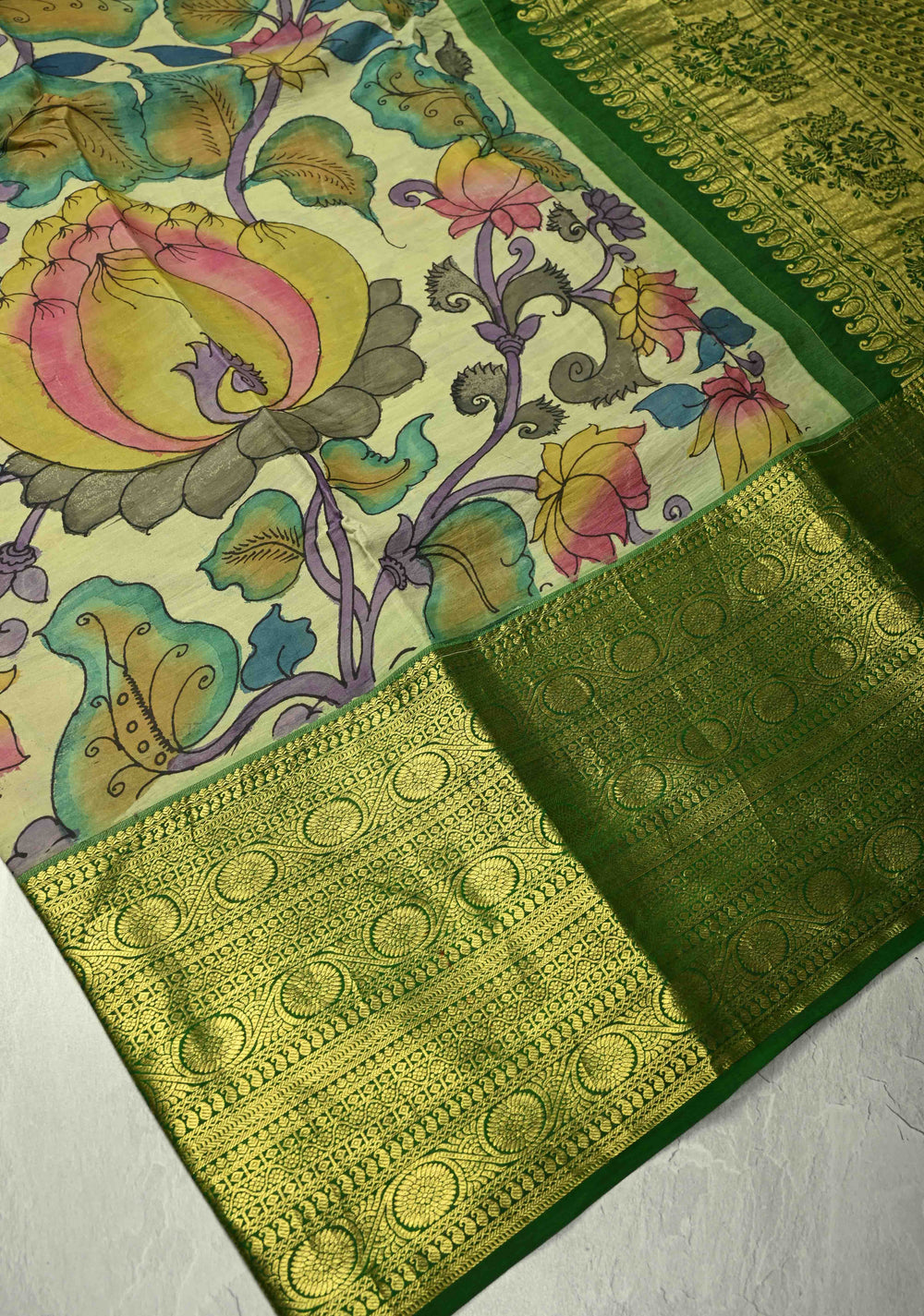 Floral Blooms Theme : Pista green Authentic Pen Kalamkari on Pure Kanjivaram Silk Saree with Wide Zari Border | SILK MARK CERTIFIED