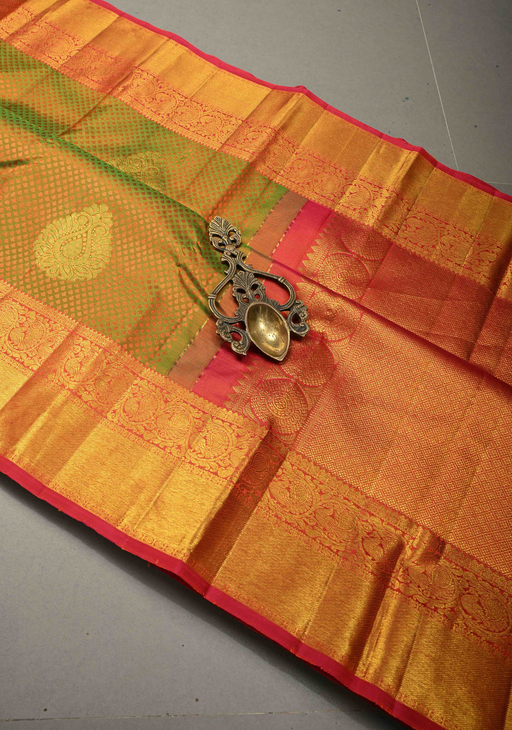 Parrot Gren Semi Tussar Tissue Saree with Contrast Temple Zari Border and Pallu