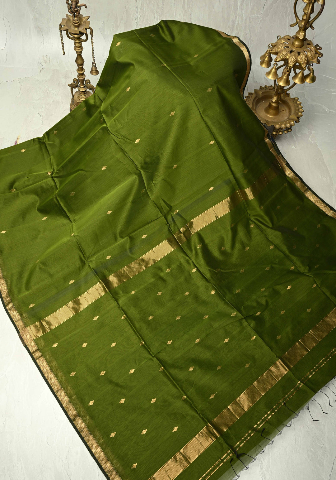 Olive Green Handwoven maheswari cotton silk saree with Zari Buttas and MInimal Border