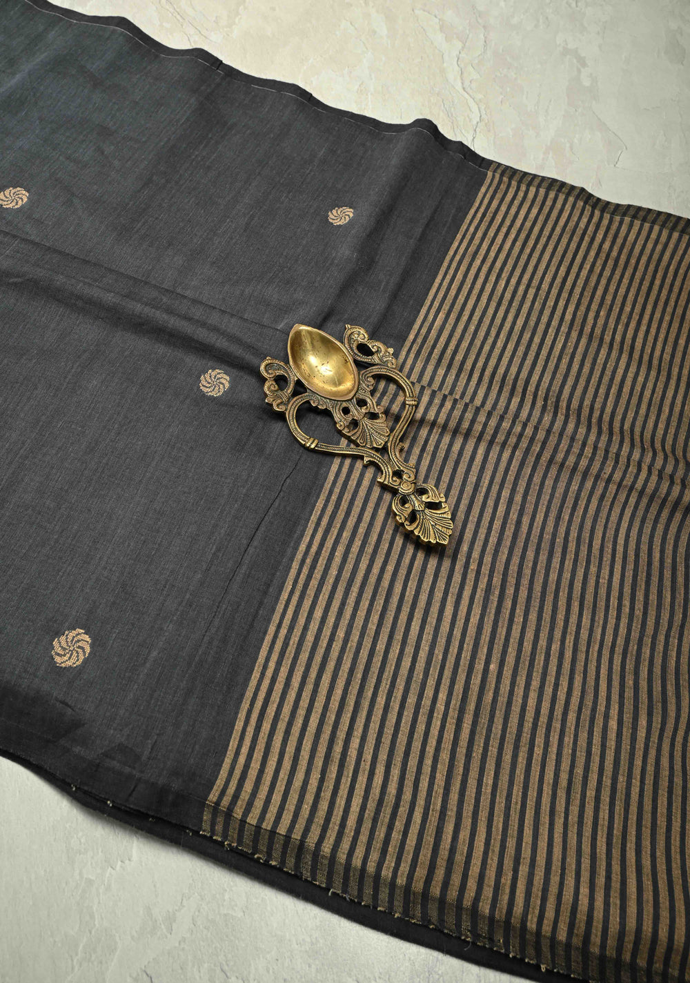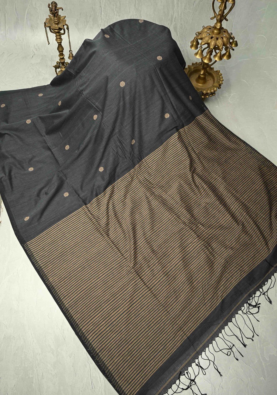 Gray Bengal Cotton Handloom saree with Resham Buttas and Long Tassels