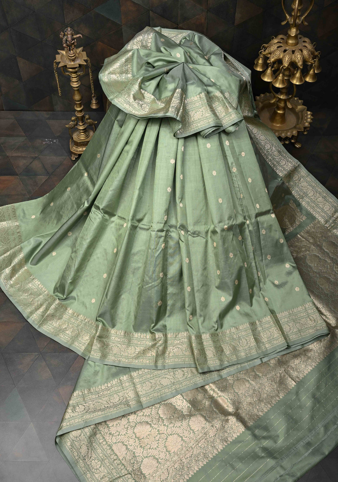 Light Sage Green Banarasi Katan Silk Saree with Meenakari Zari Butta And Zari Border | SILK MARK CERTIFIED