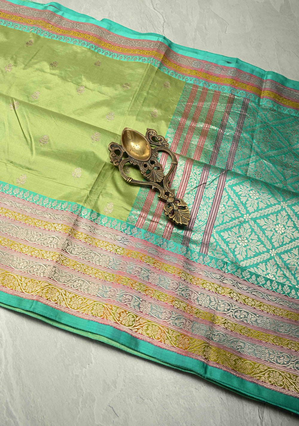 Light lime Green Katan Silk Handloom Saree with Floral Zari Buttas and Meenakari Border | SILK MARK CERTIFIED