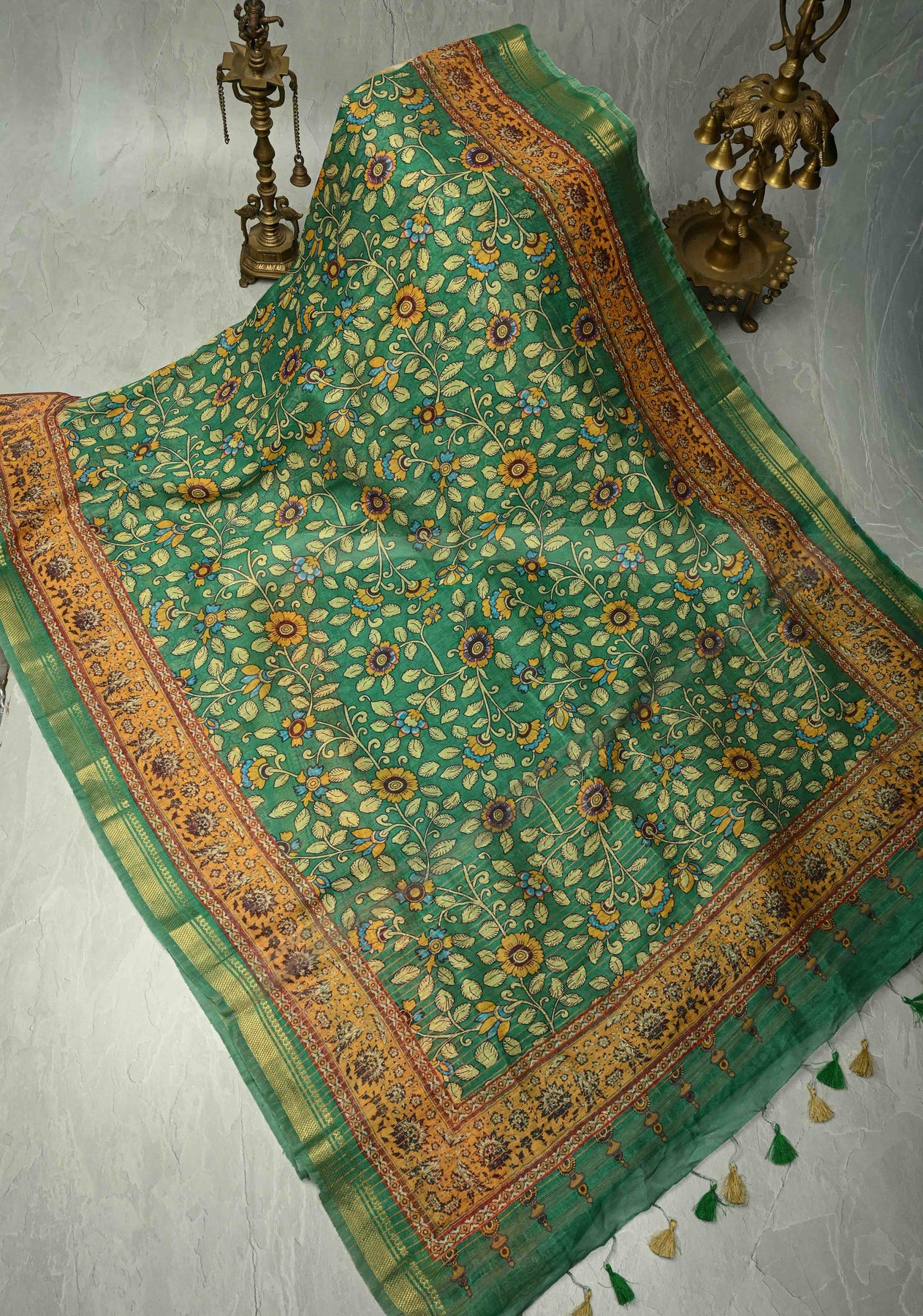 Green Silk Linen Saree with kalamakari Floral digital Print and Minimal Zari Border
