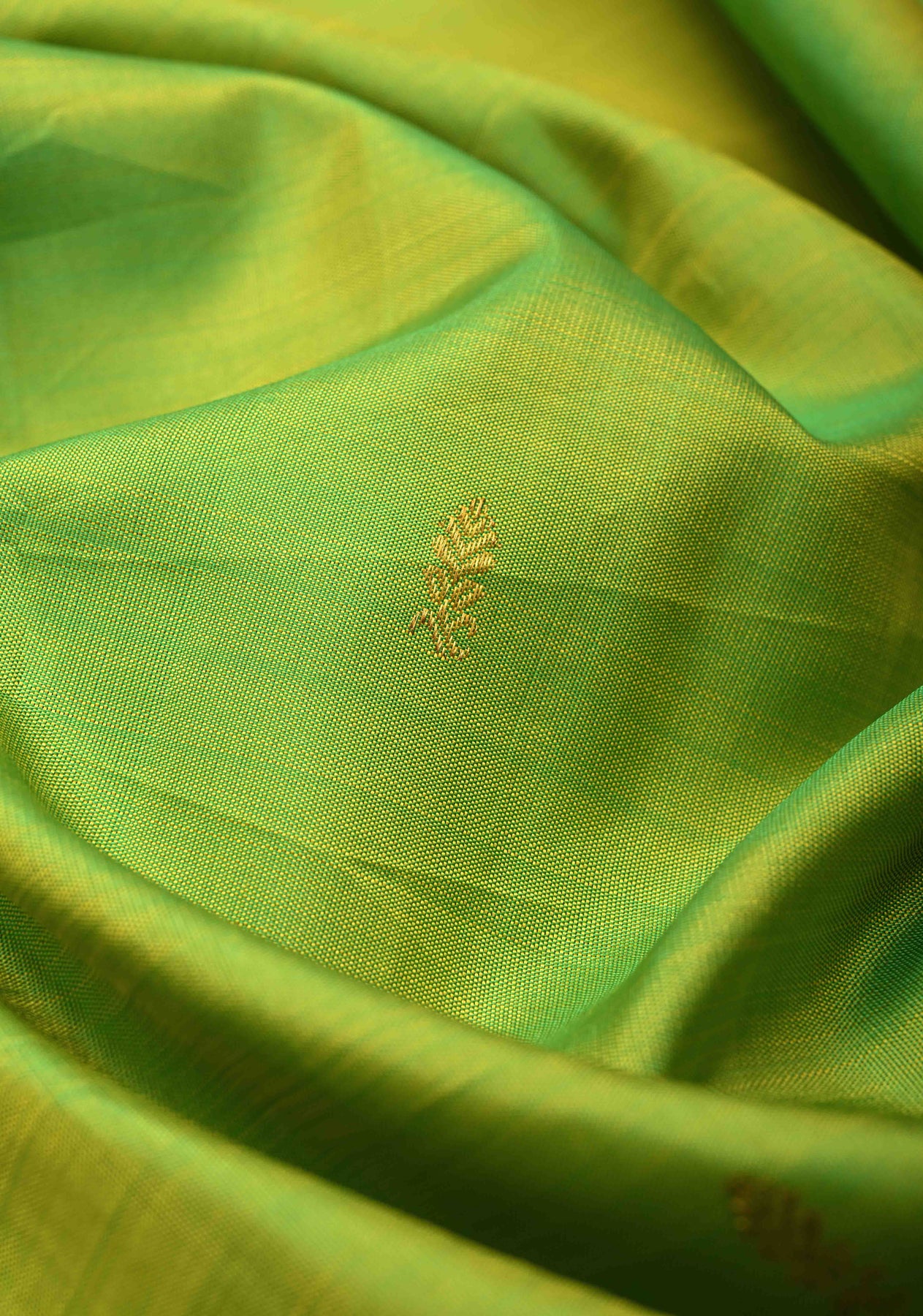 The body features a rich chartreuse green hue, a fresh and radiant shade that exudes understated opulence. Scattered across the body are delicate zari buttis, adding subtle shimmer and a graceful touch of intricacy. Each butti is a testament to the skill of the artisan, reflecting heritage in every thread.