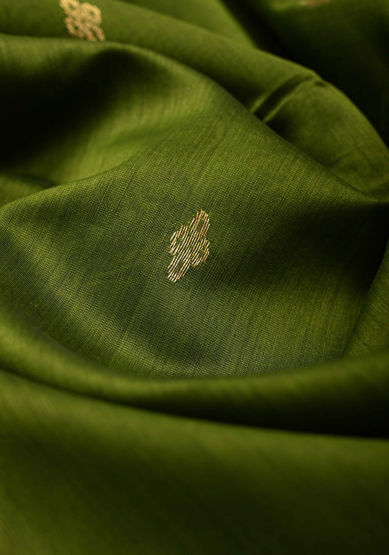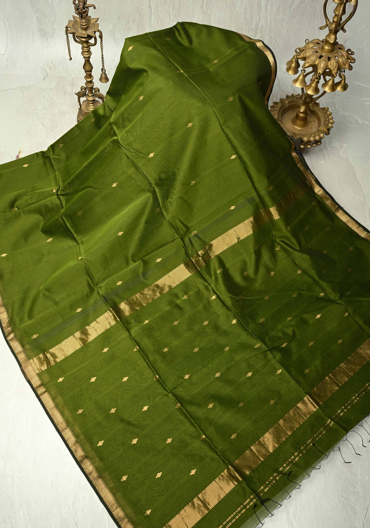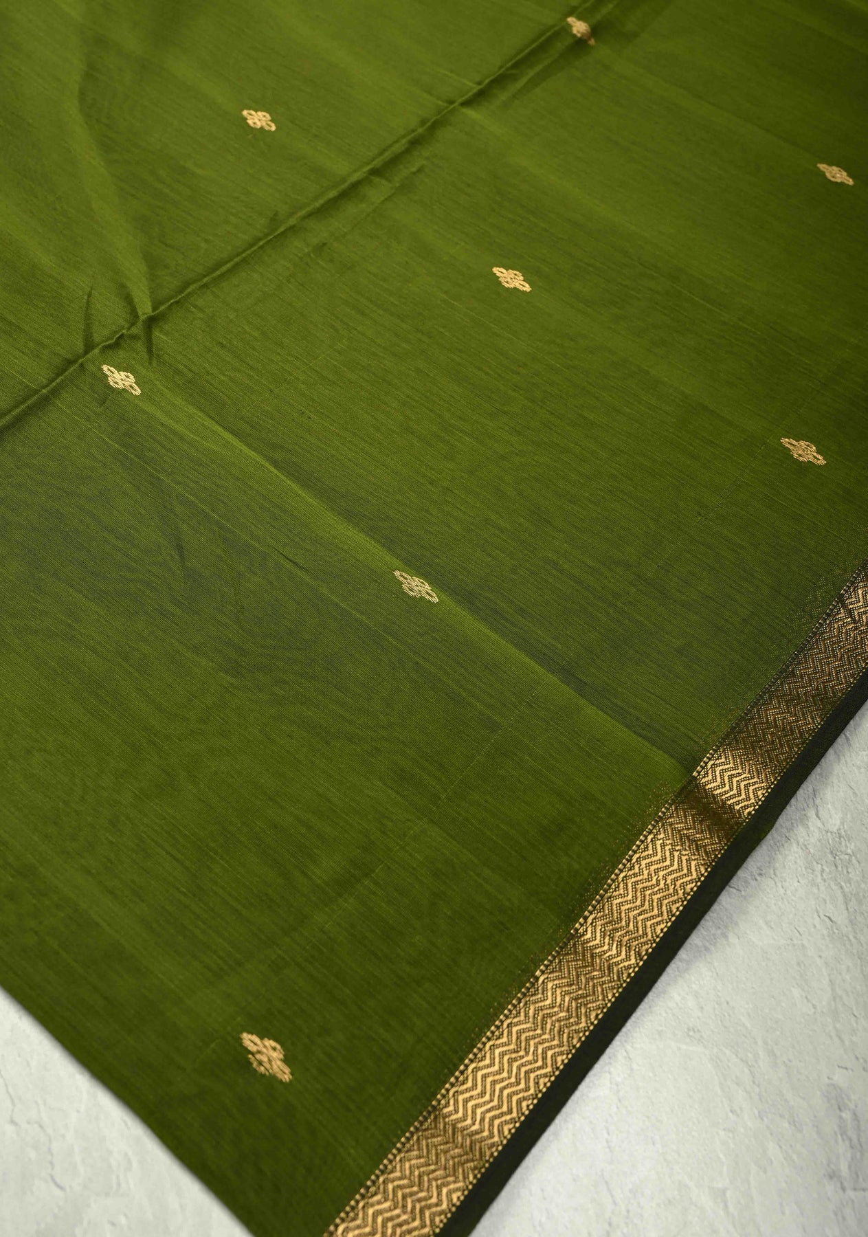 Embrace understated elegance with this Collard Green Maheswari Cotton Silk Saree, featuring delicate zari buttas and a minimalistic border that highlights its sophisticated charm. Handwoven with precision, this saree offers a lightweight, airy texture ideal for both casual and festive occasions.