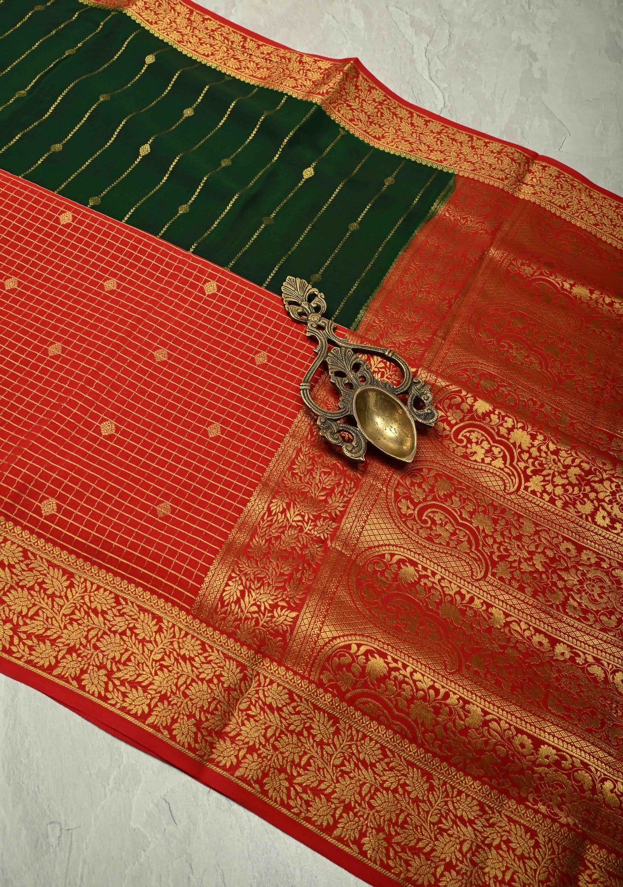 This Dark Green–Red Half Border Mysore Silk Saree is a stunning fusion of vibrant colors and traditional weaving artistry. The dark green body is adorned with elegant zari checks, adding a subtle yet sophisticated shimmer. Complementing this, the contrasting red half border features bold vertical zari stripes that elevate the saree’s visual appeal with a touch of grandeur. Crafted from Mysore silk, the saree drapes beautifully with a smooth, lustrous finish that exudes timeless elegance. Perfect for weddings, festive celebrations, and special occasions, this saree seamlessly blends heritage aesthetics with refined style.