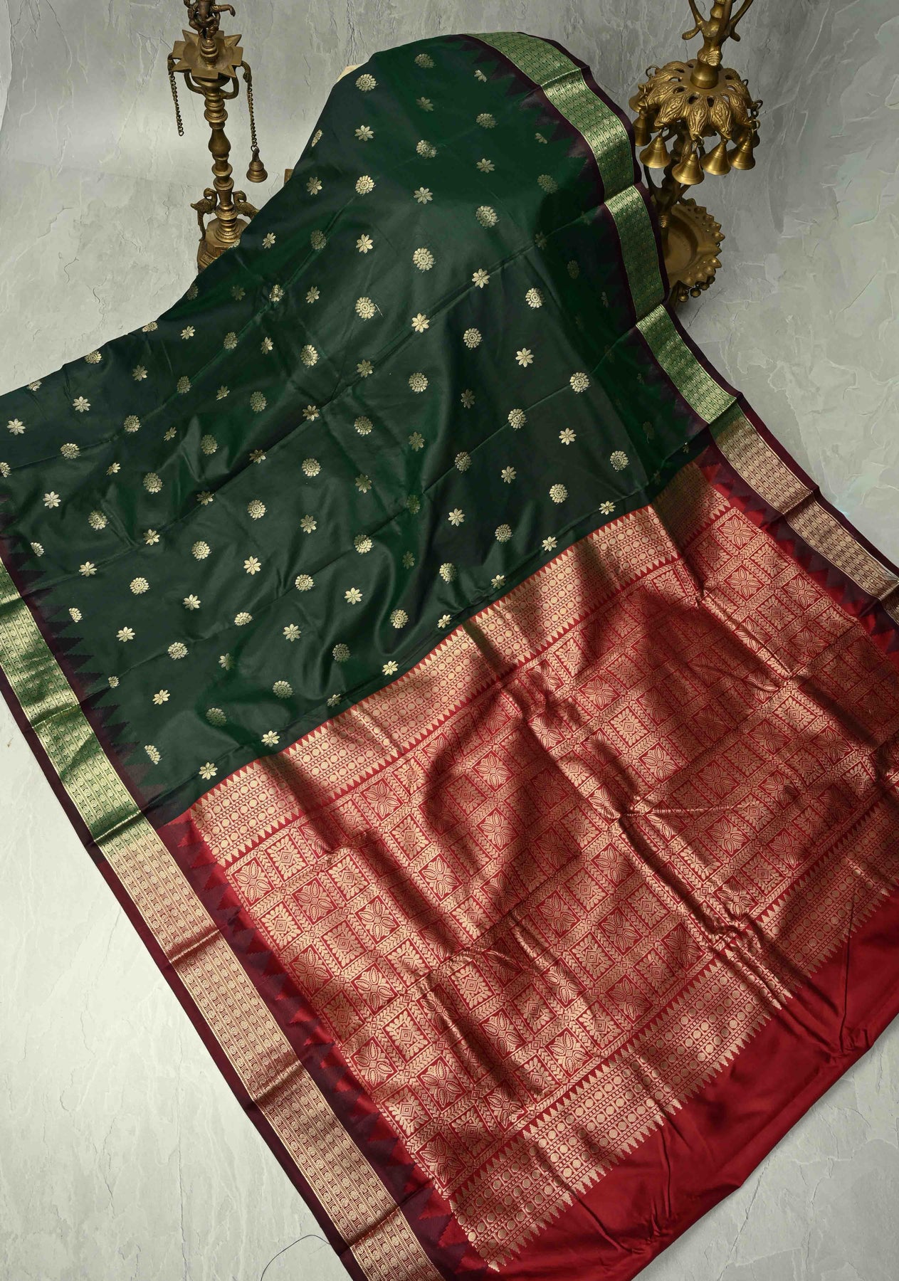 The saree is adorned with delicate floral buttas spread across the fabric, adding a touch of femininity and charm. Its temple-inspired zari border enhances the traditional aesthetic, giving the saree a regal appeal suitable for weddings, festive celebrations, and formal occasions
