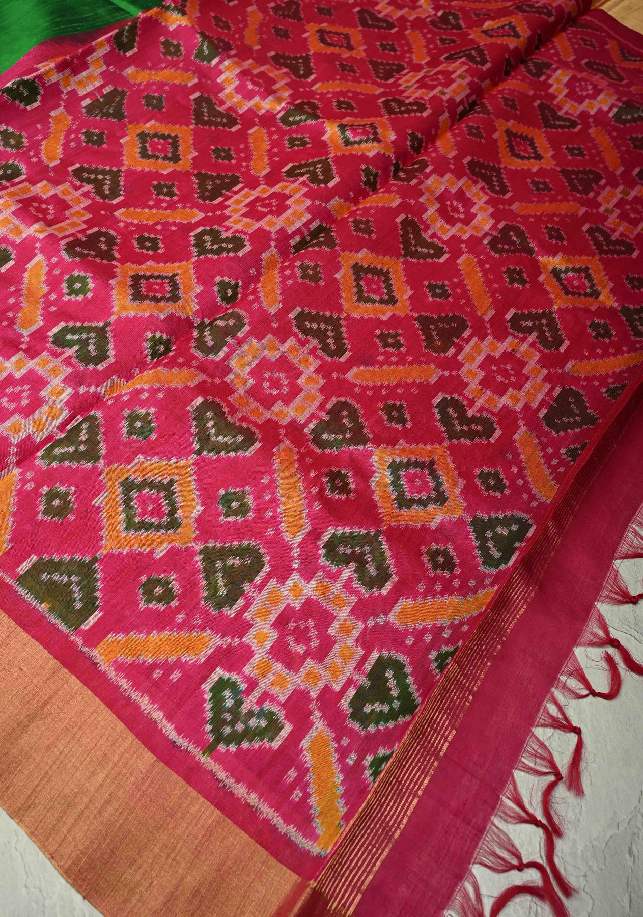 The saree features delicate floral embroidery, adding intricate texture and sophistication to the vibrant green fabric. The Ikkat pallu showcases traditional geometric patterns, blending artisanal craftsmanship with contemporary style for a heritage-inspired look.