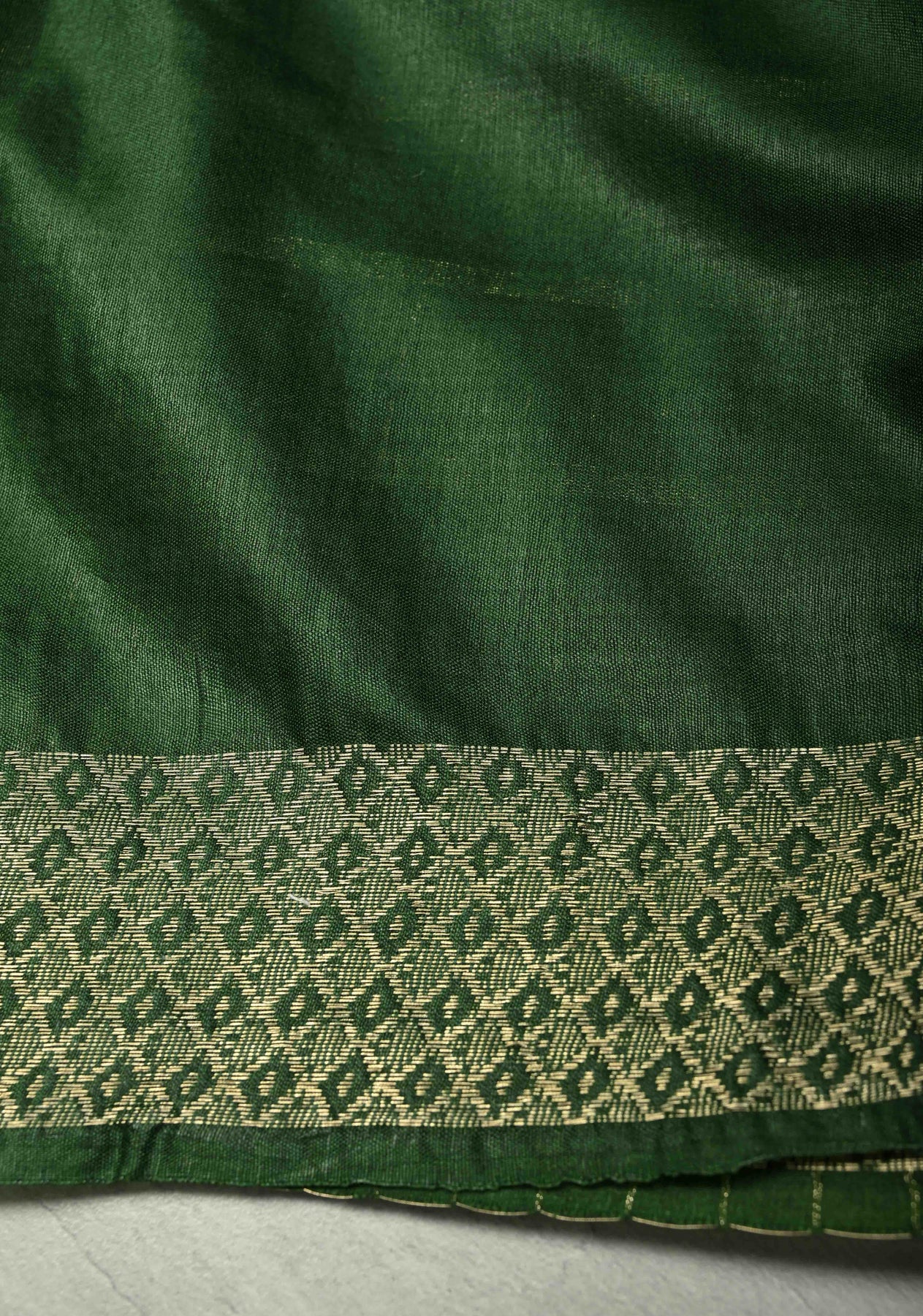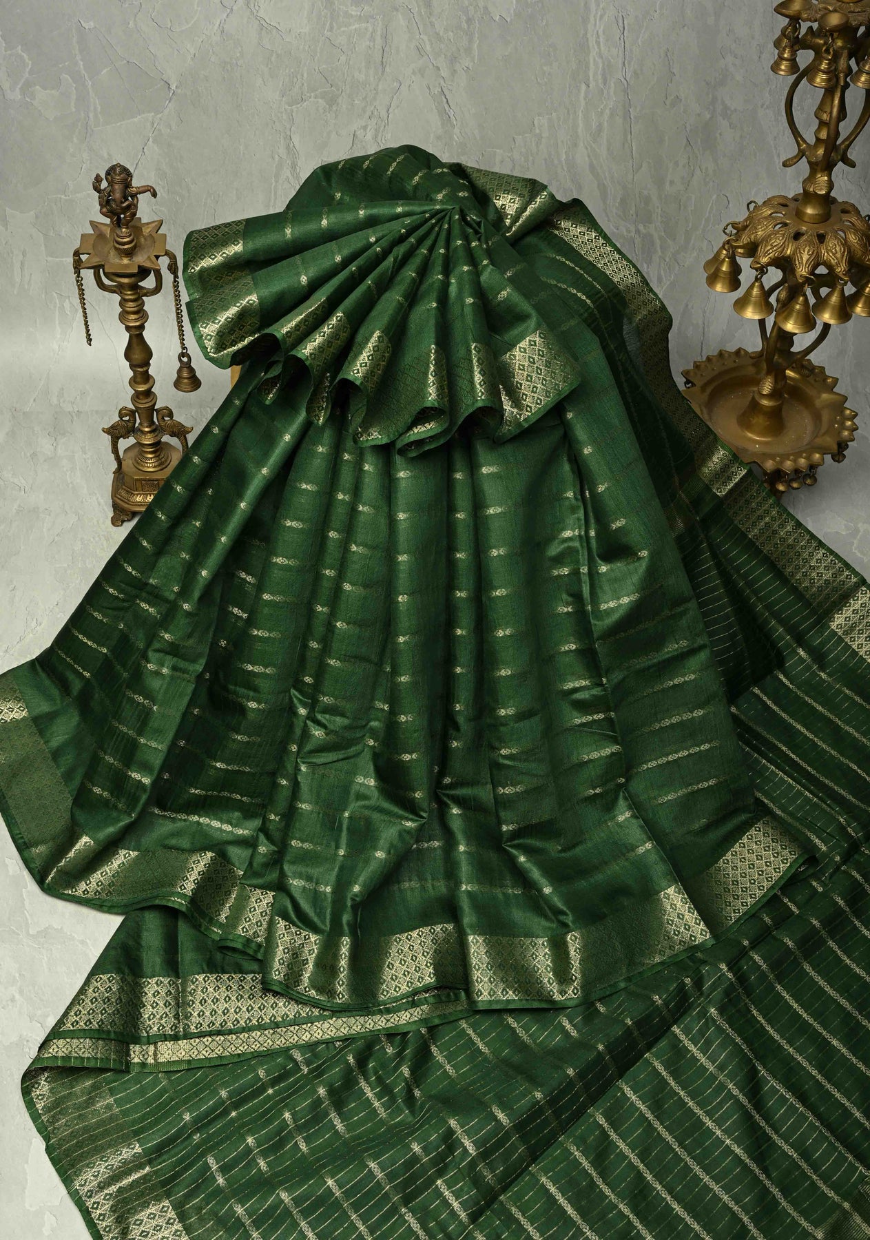 The saree features elegant zari stripes running across the body, adding a subtle shimmer that complements the deep green hue with effortless sophistication. A finely crafted zari border frames the saree, giving it a touch of tradition and enhancing its festive appeal without overpowering its simplicity.