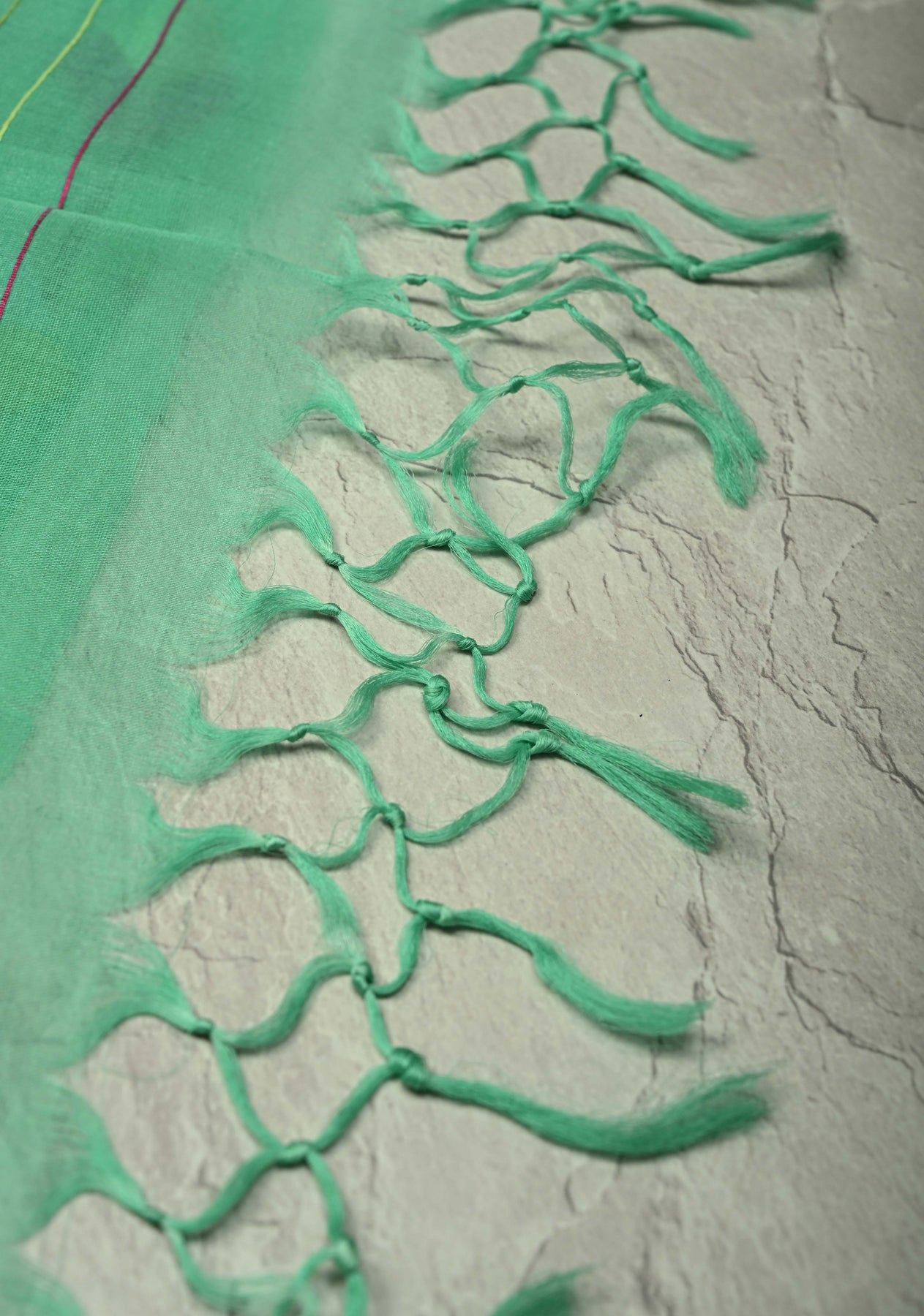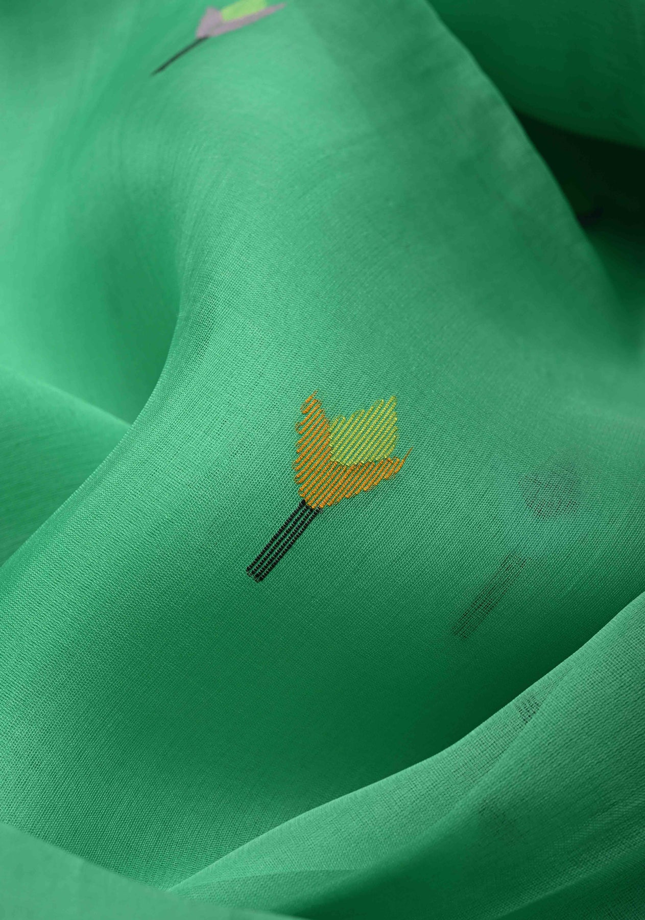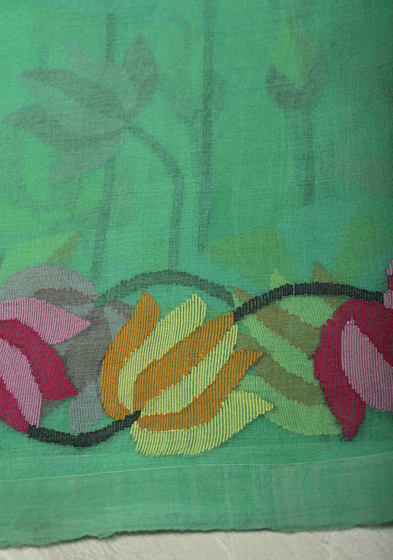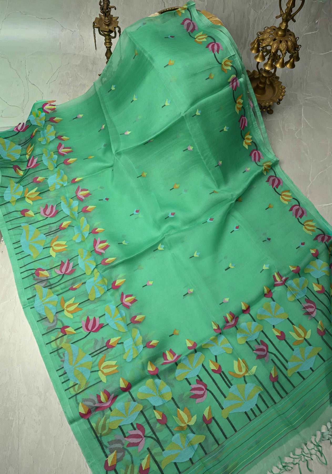 A Mint green muslin silk saree with resham full-body Jamdani weaving is a beautiful blend of subtle elegance and traditional artistry. Crafted from ultra-soft, lightweight muslin silk, it drapes gracefully with an airy, luxurious feel. The soothing sage green hue adds a touch of serenity and sophistication, while the intricate resham Jamdani motifs woven across the entire body showcase meticulous craftsmanship and timeless design. Each handwoven pattern enhances the saree’s texture and depth, creating a harmonious balance between tradition and contemporary charm. Perfect for festive celebrations, weddings, or special occasions, this saree is a refined statement piece that embodies grace and heritage
