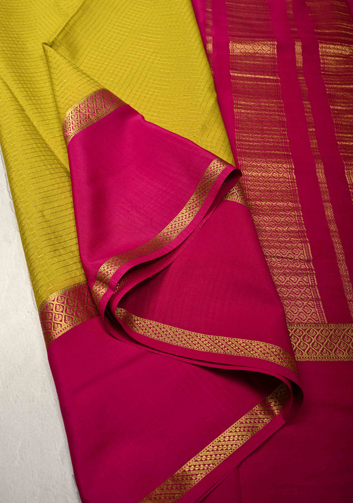 This Moss Green Pure Mysore Silk Saree is a graceful blend of subtle elegance and traditional craftsmanship. The soothing moss green body is embellished with Podi-Kattam zari checks, creating a delicate geometric texture that enhances its refined appeal. Woven from pure Mysore silk, the saree offers a soft, lustrous finish and a lightweight, flowing drape. The contrast zari border adds a striking accent, infusing the saree with a touch of richness and regal charm. Perfect for festive occasions, weddings, and cultural celebrations, this saree exudes timeless sophistication.