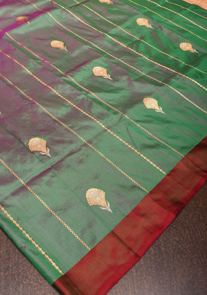 The dual-tone effect, transitioning gracefully between green and pink, creates a captivating and dynamic visual impact. The saree is adorned with intricate zari stripes that add a subtle shimmer and texture, enhancing its overall elegance with a refined, contemporary touch.