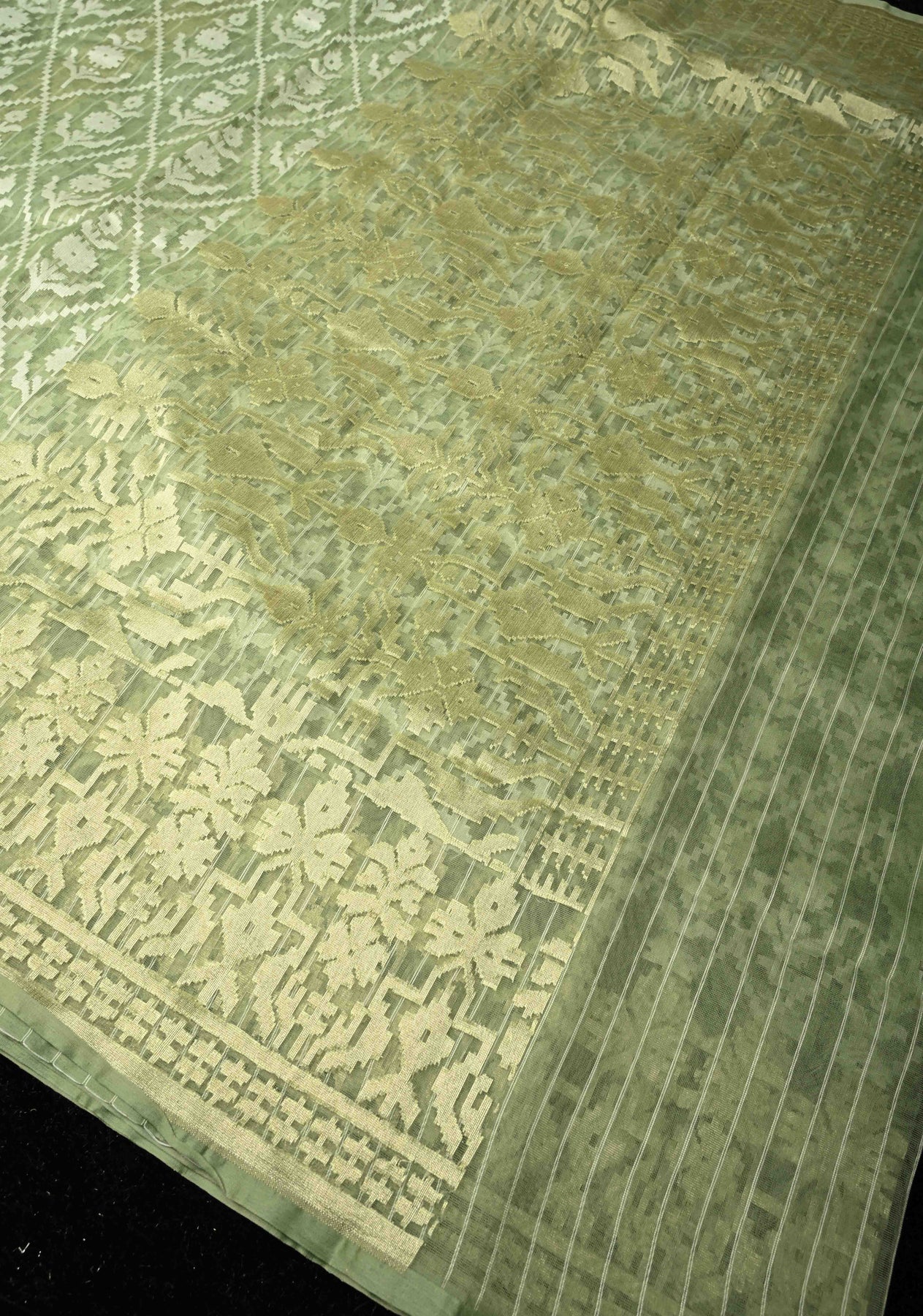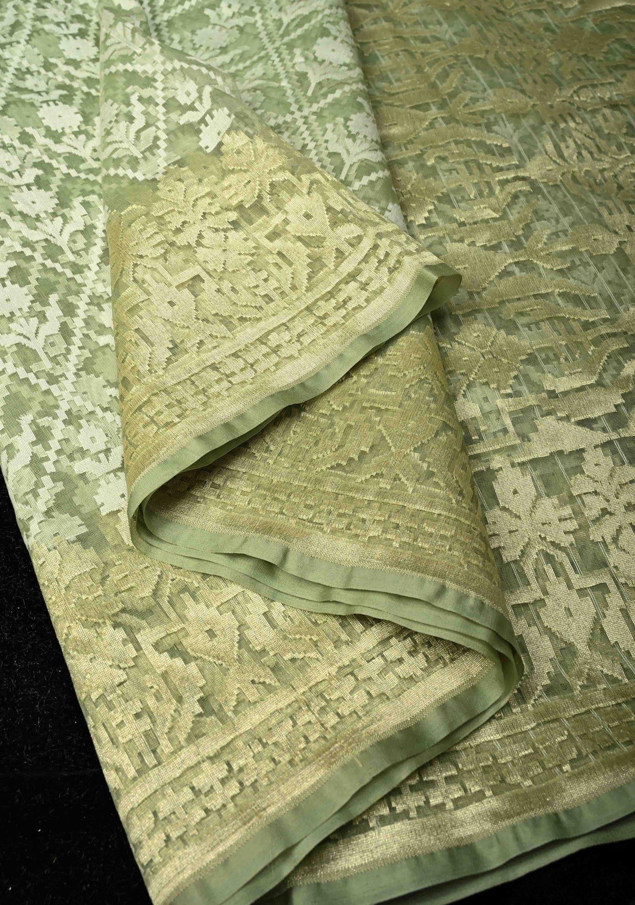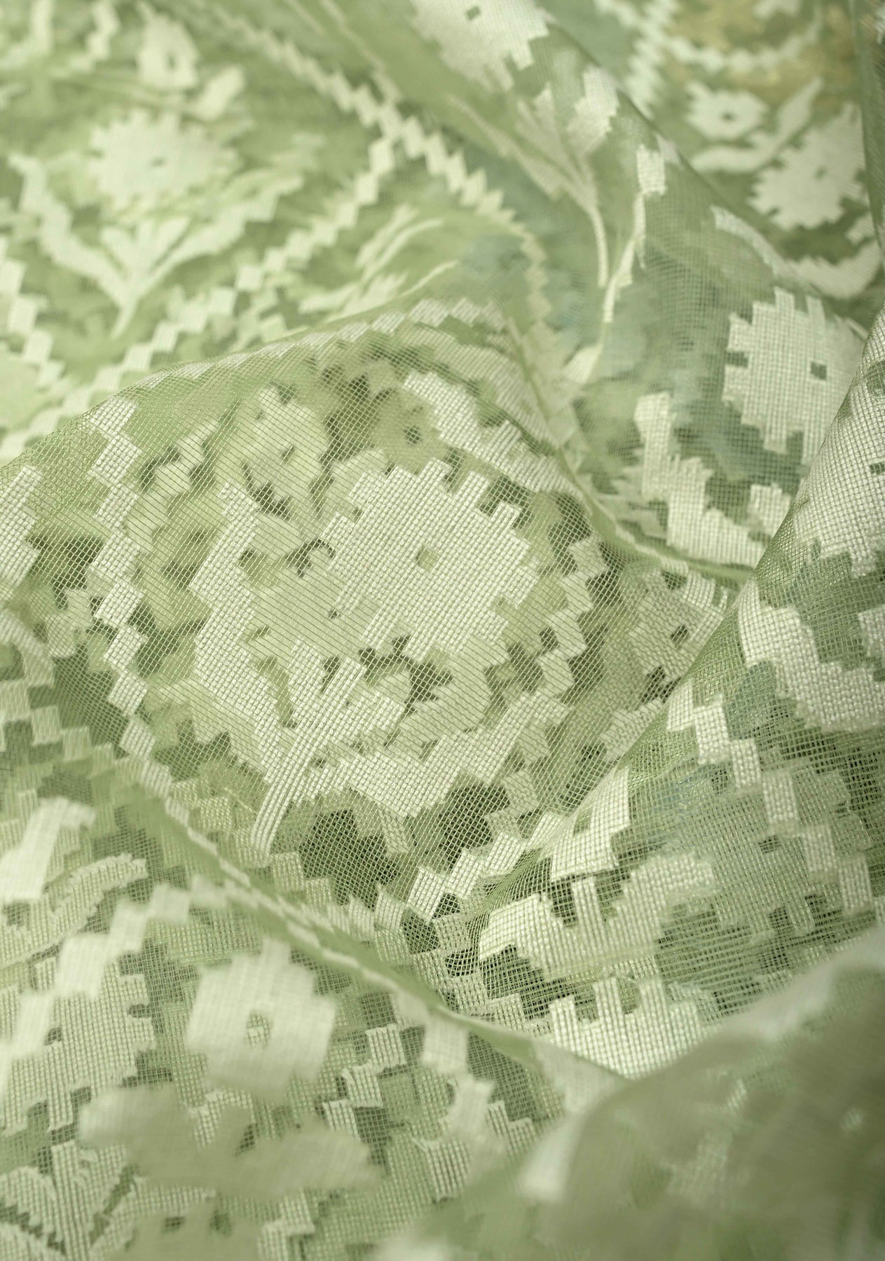 Pastel Green Handloom Banarasi Meenakari Net Saree with Featuring Jamdani Style Embossed design | SILK MARK CERTIFIED