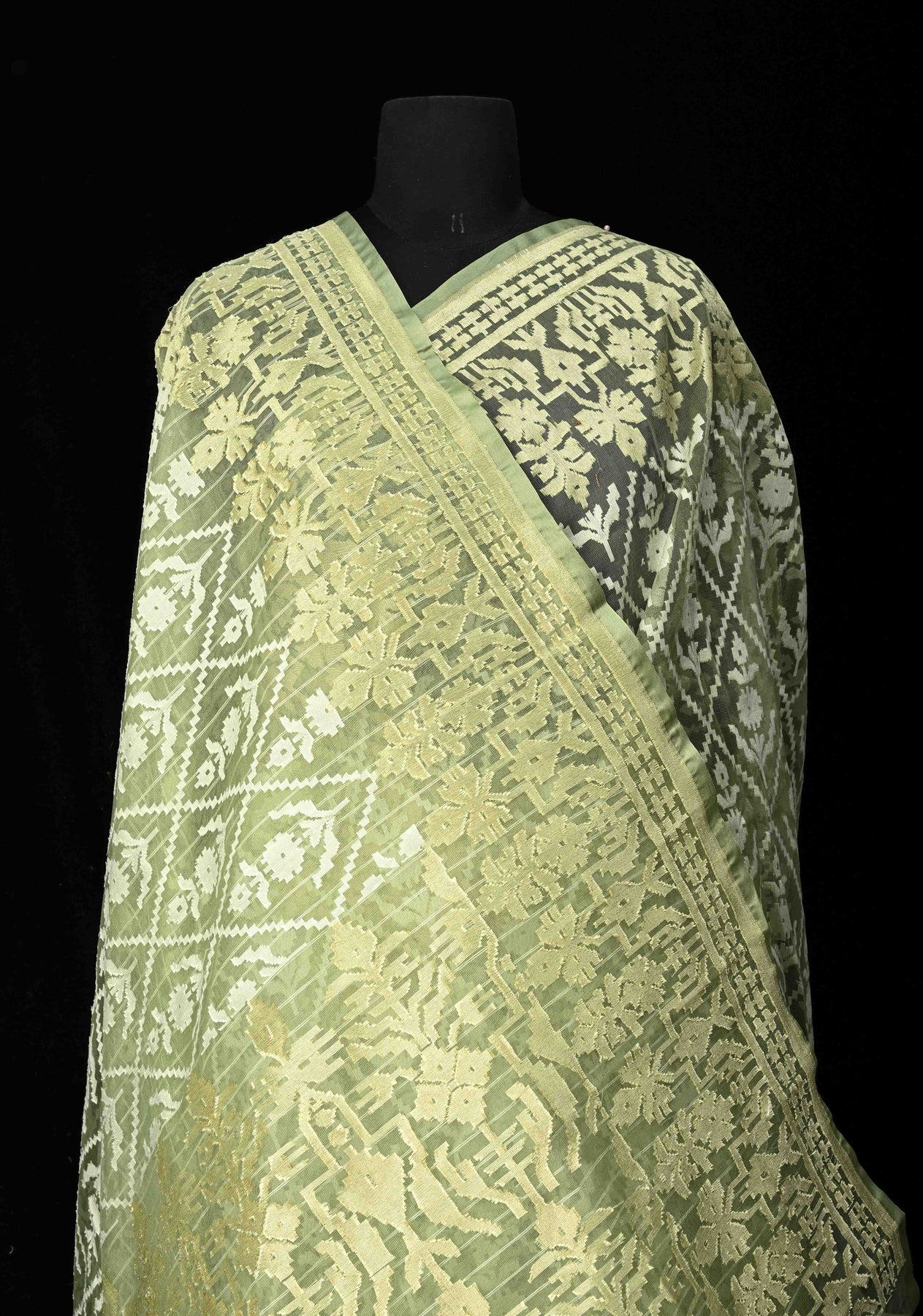 Pastel Green Handloom Banarasi Meenakari  Net Saree with Featuring Jamdani Style Embossed design | SILK MARK CERTIFIED