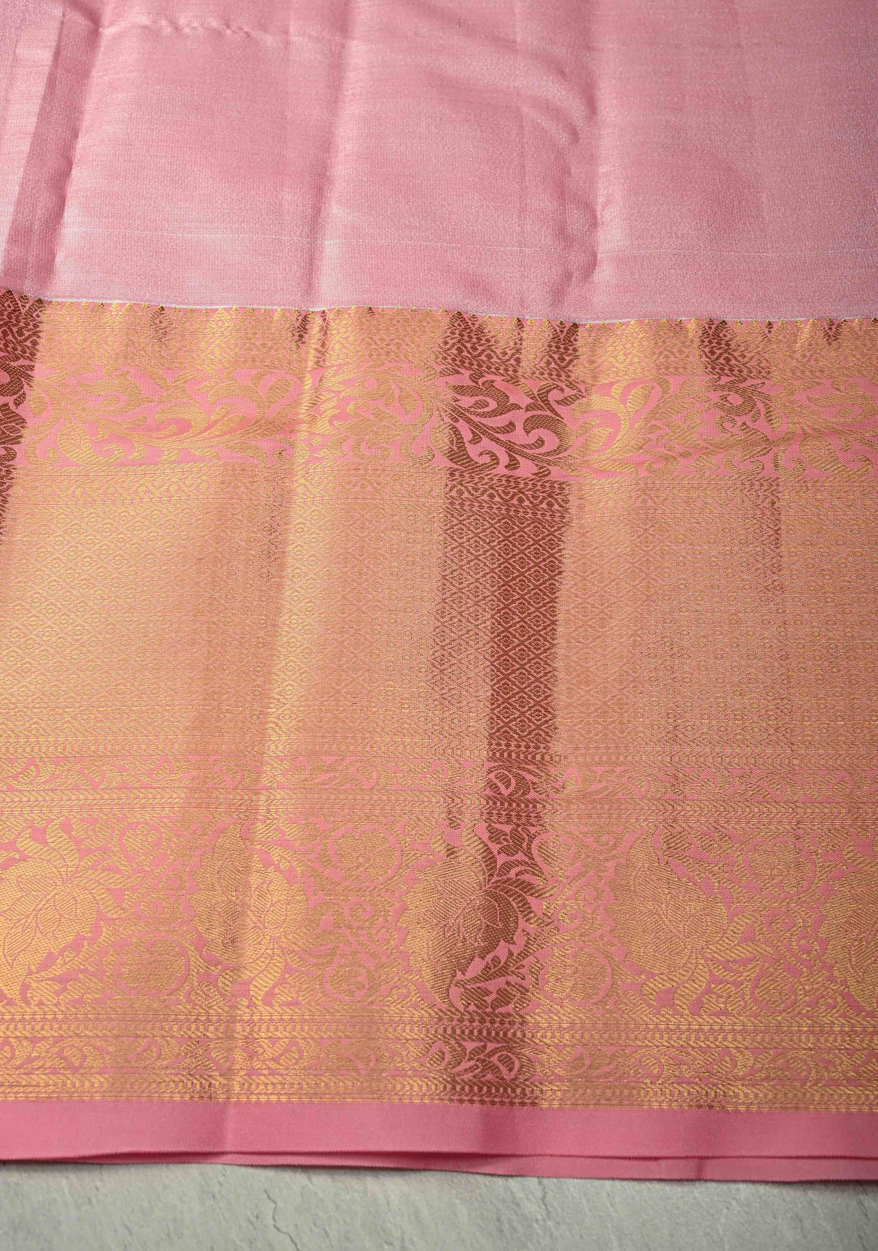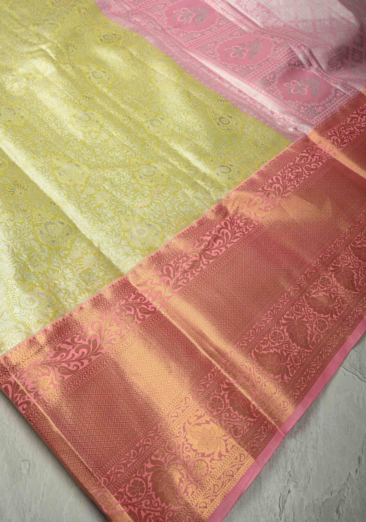 Pastel lime Green Kanjivaram Tissue Semi Silk Saree with Meenakari Floral Brocade Jaal and Contrast Wide Zari Border