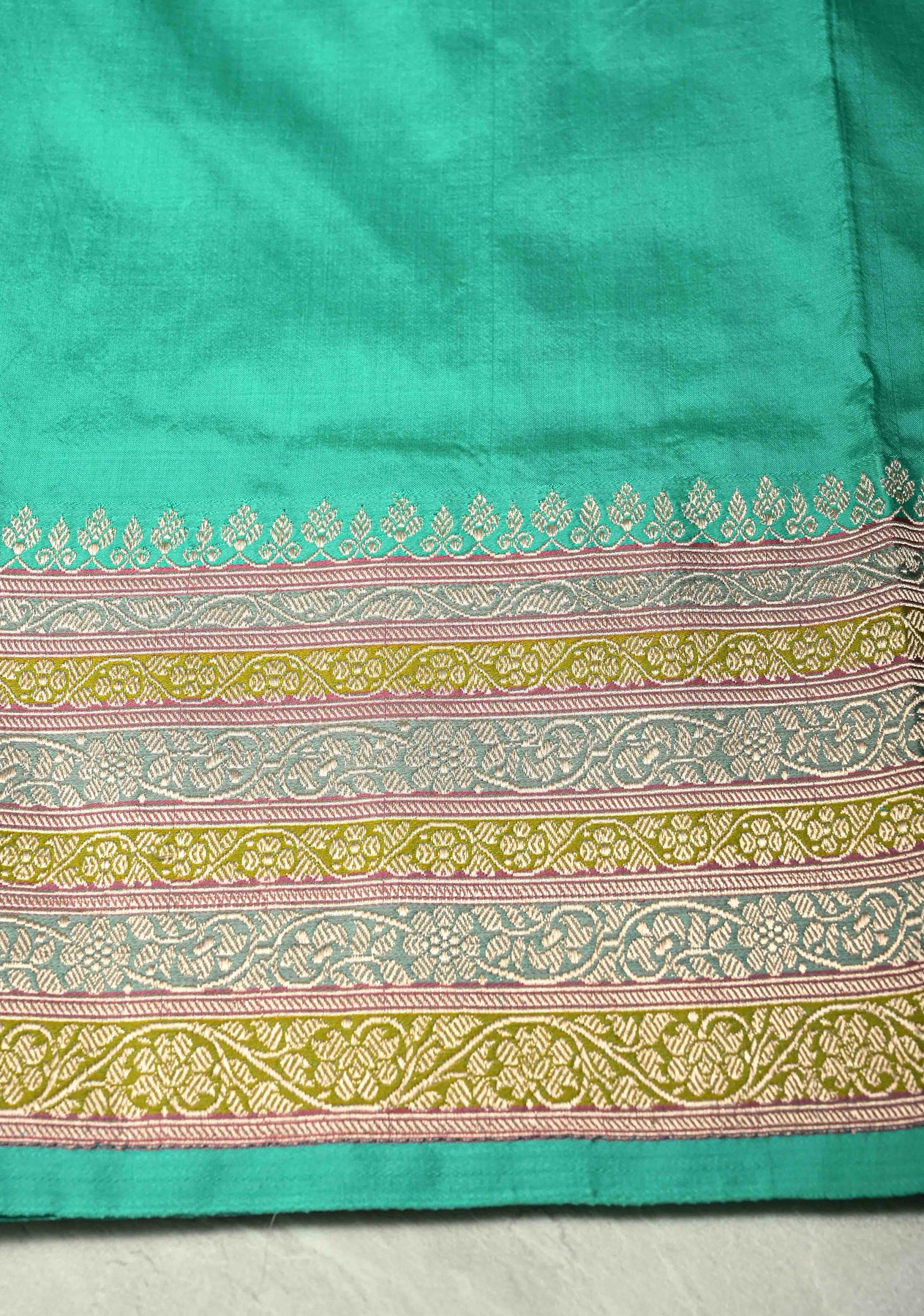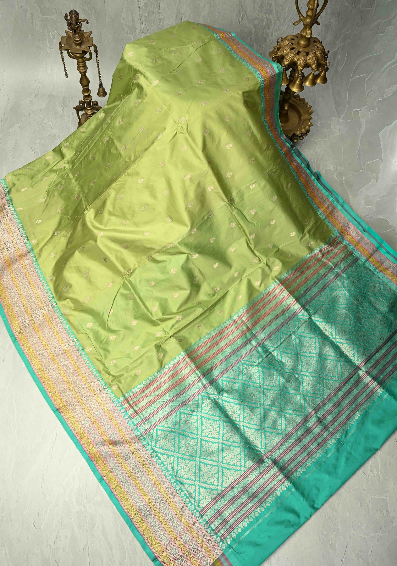 Light lime Green Katan Silk Handloom Saree with Floral Zari Buttas and Meenakari Border | SILK MARK CERTIFIED