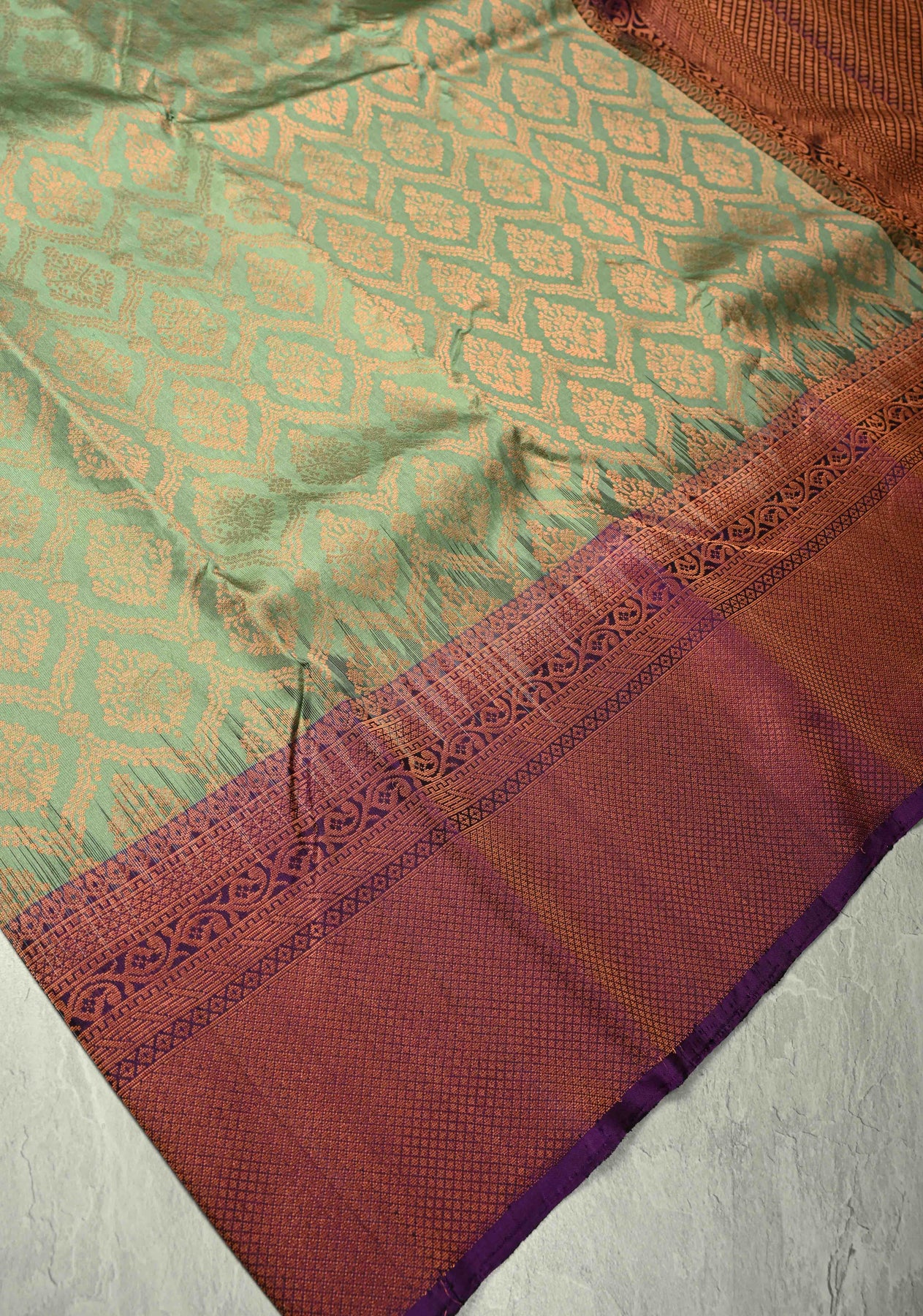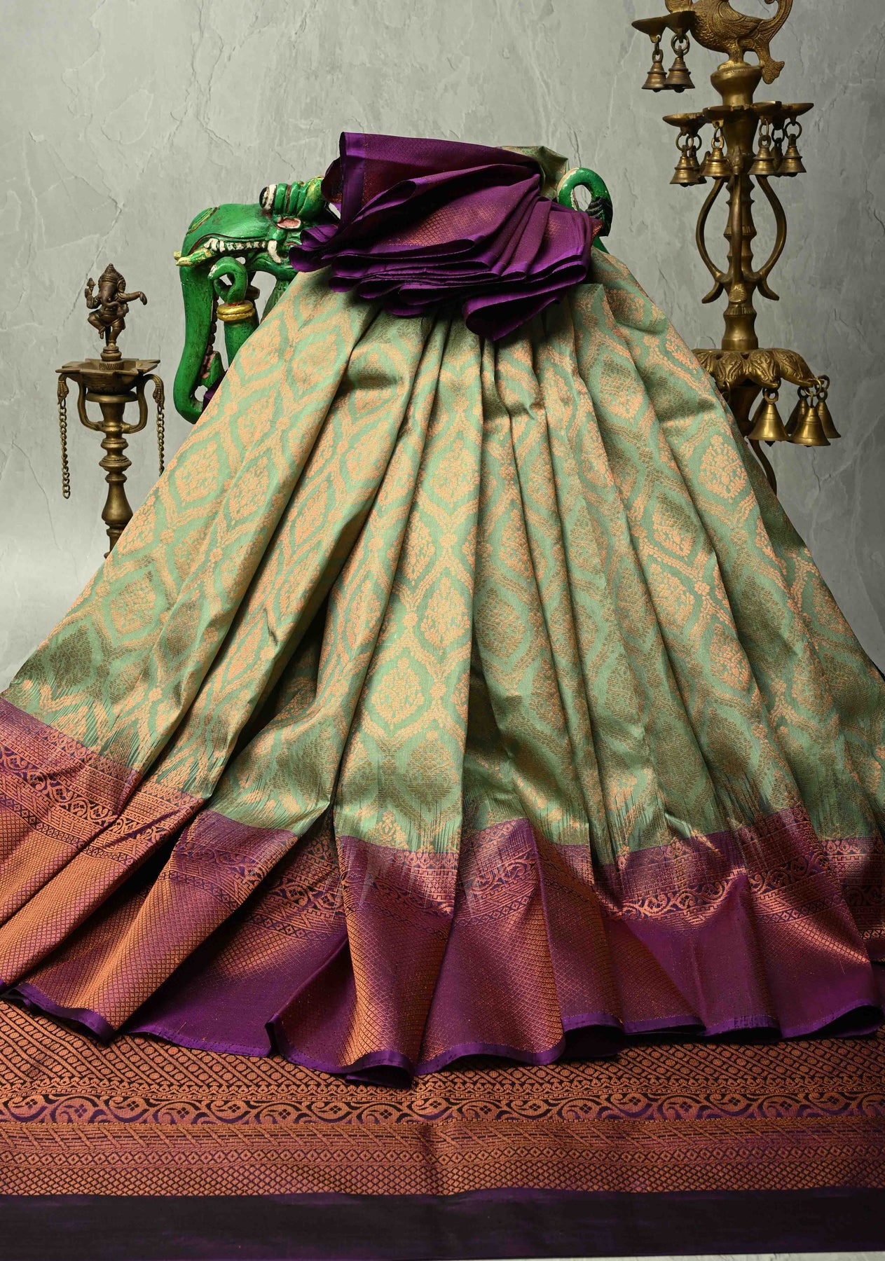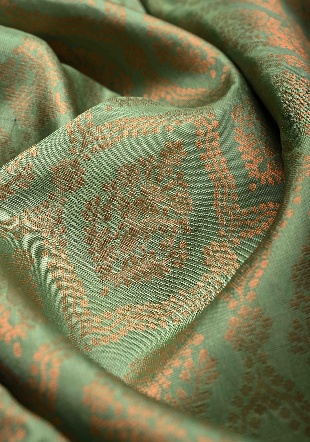 Pure Banarasi Soft Silk Saree in Spring Green with Antique Floral Brocade Jaal and Contrast Border | SILK MARK CERTIFIED