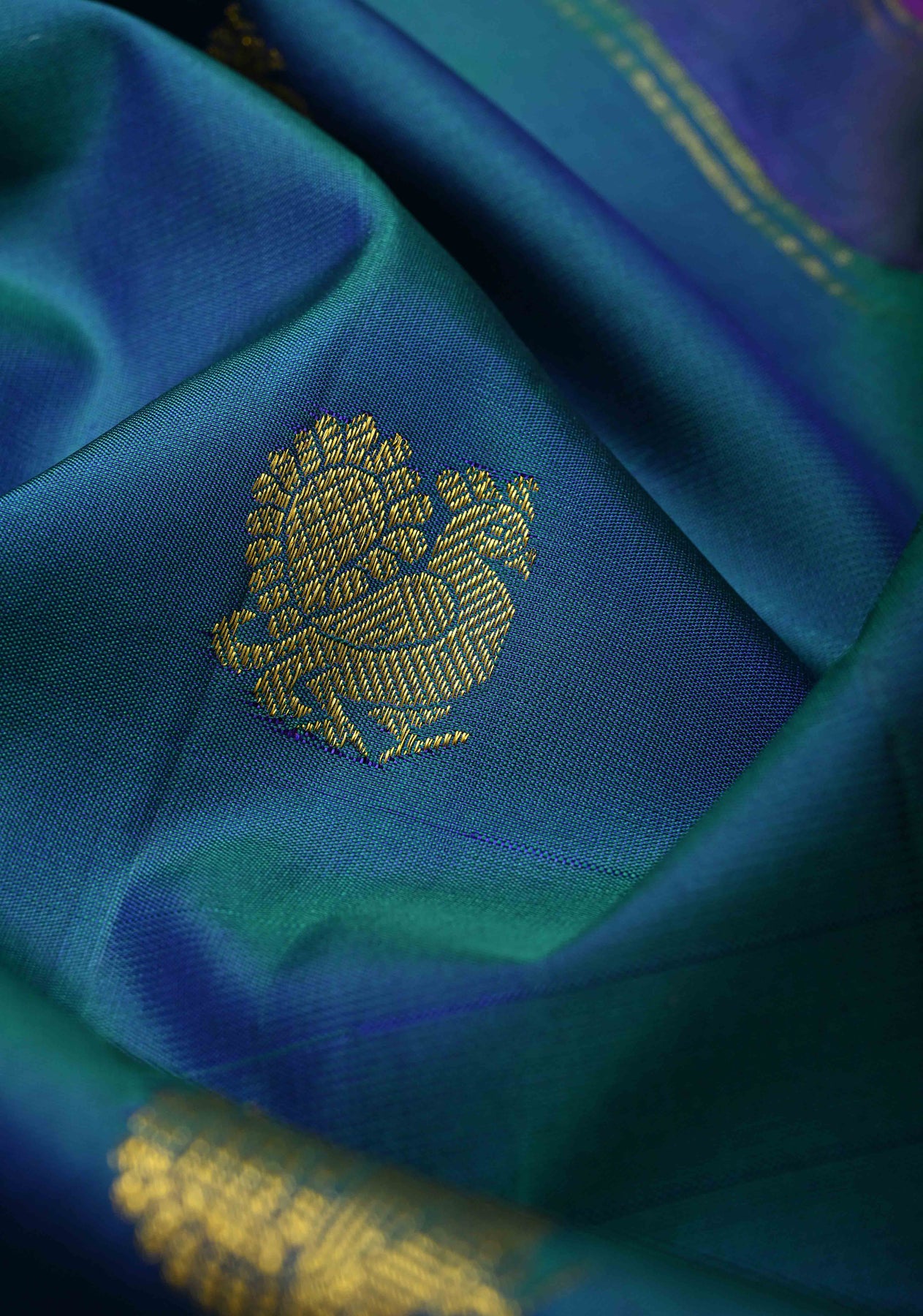 Celebrate tradition with grace in this Peacock Green Dual Tone Pure Kanjivaram Silk Handloom Saree, a true testament to South Indian weaving heritage. The luminous dual-tone silk body is adorned with intricately woven Zari motifs, symbolizing harmony and wholeness. Adding to its charm is the distinct peacock motif on the border, a regal detail that highlights the saree’s artistic brilliance. Woven on handlooms using fine mulberry silk, this saree combines elegance, symbolism, and craftsmanship—making it perfect for weddings, cultural ceremonies, or festive occasions.