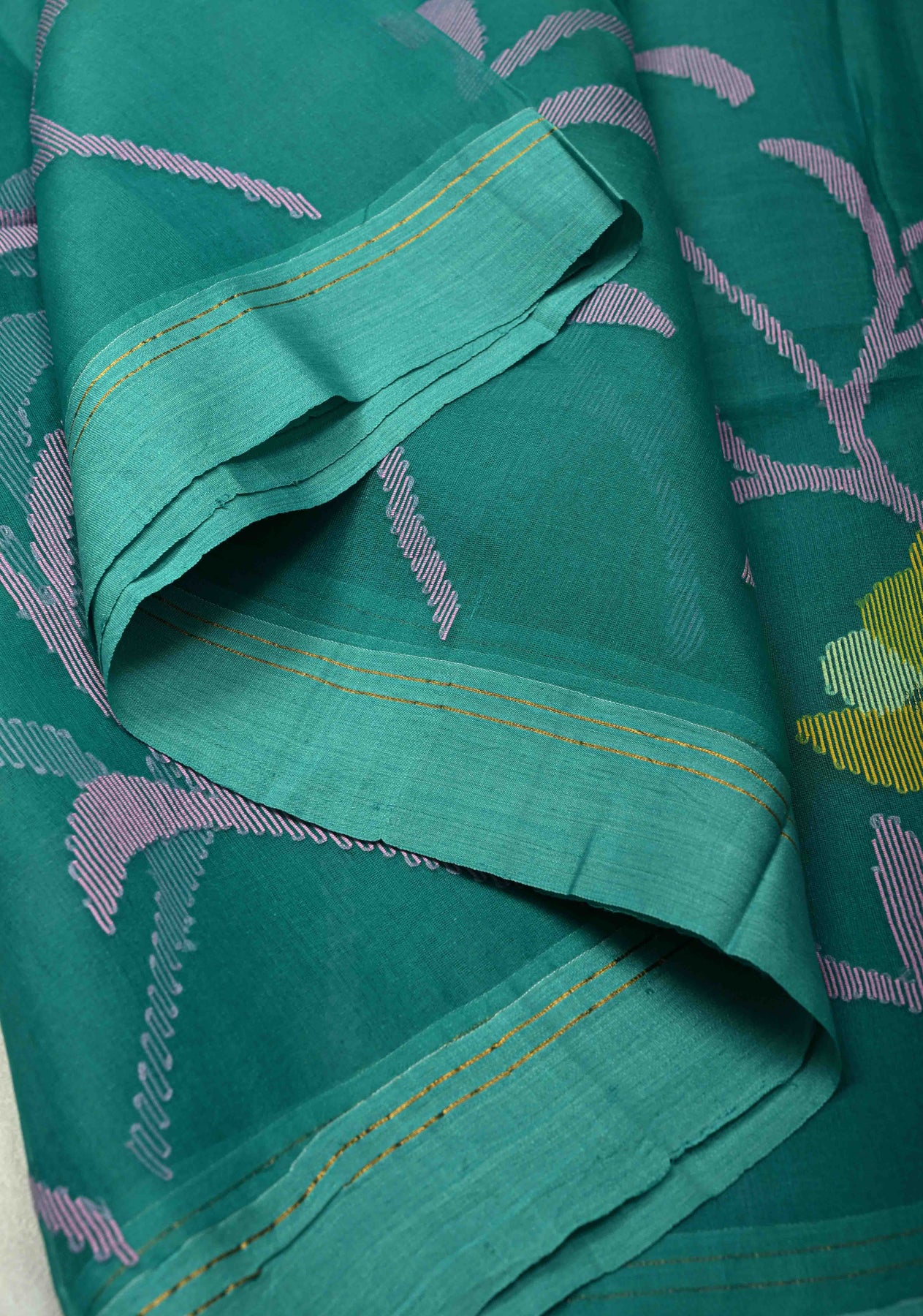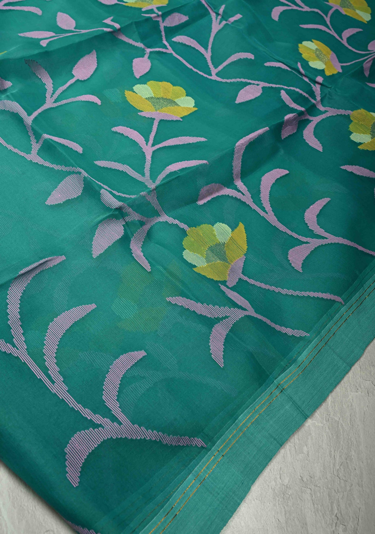 Radiate refined elegance with this Rama Green Silk Muslin Saree, adorned with intricate Meenakari designs and exquisite Resham Jamdani weaving. The rich green hue brings vibrance and grace, while the detailed border-pallu enhances its traditional charm. Crafted from silk muslin, this saree offers a soft texture and effortless drape — perfect for festive celebrations, weddings, or formal gatherings. Pair it with gold or kundan jewelry to complete a look that’s timeless, regal, and sophisticated.