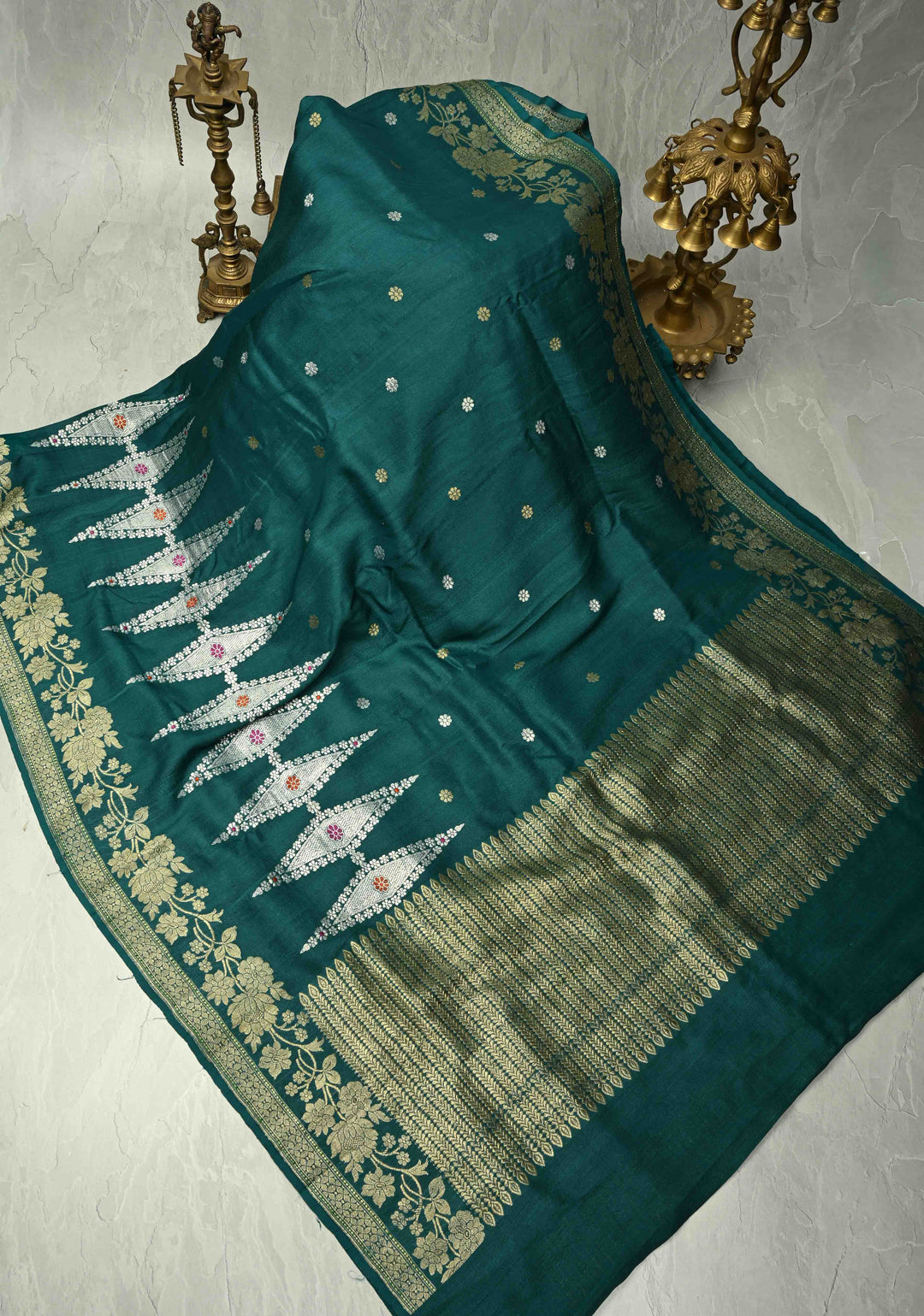 Peacock Green Floral Design on Banarasi Tussar Georgette Saree with Meenakari Diamond Pannel and Zari Border| SILK MARK CERTIFIED