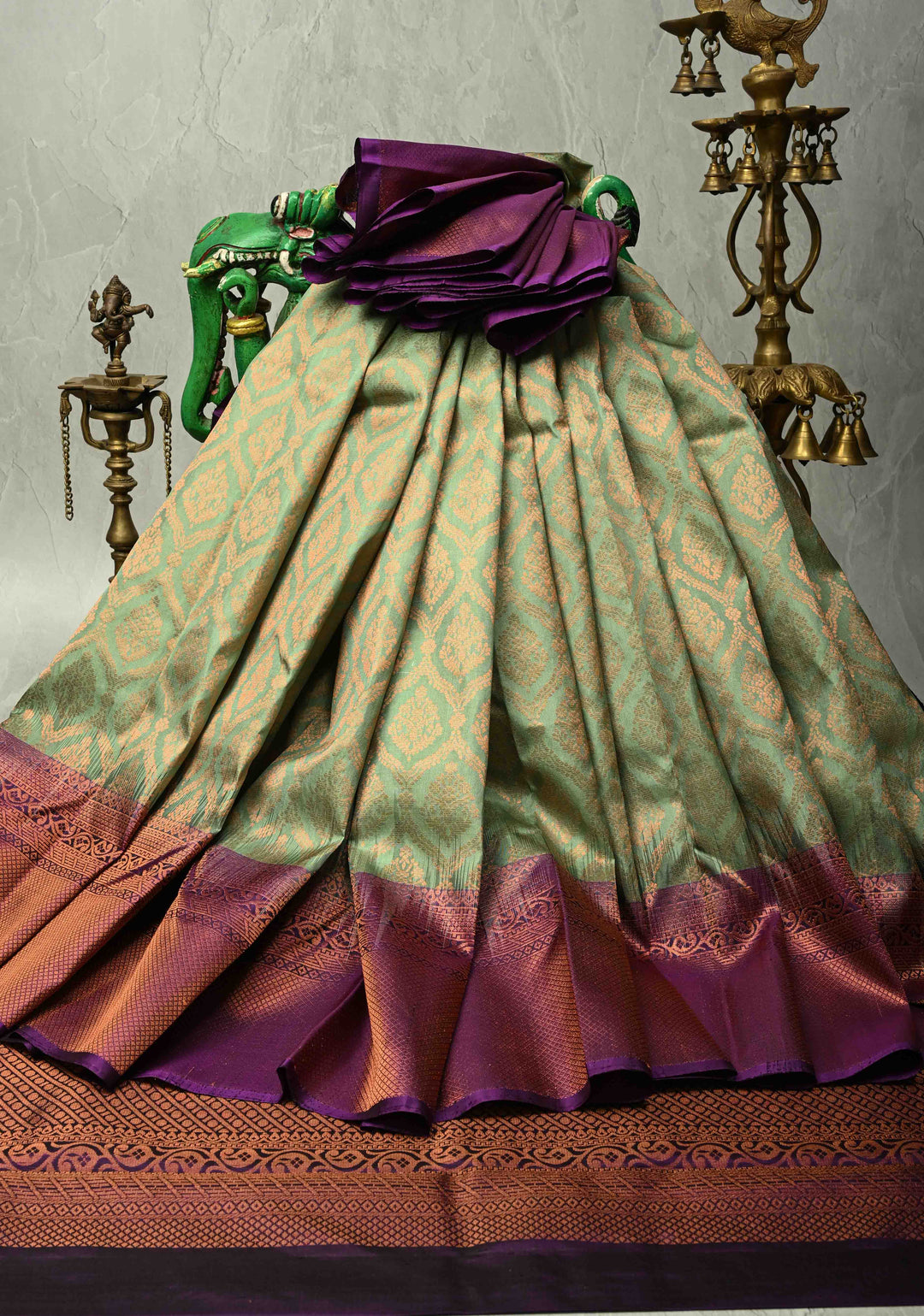 Sea Green Kanjivaram Tissue Semi Silk Saree with Meenakari Floral Brocade Jaal and Contrast Wide Zari Border