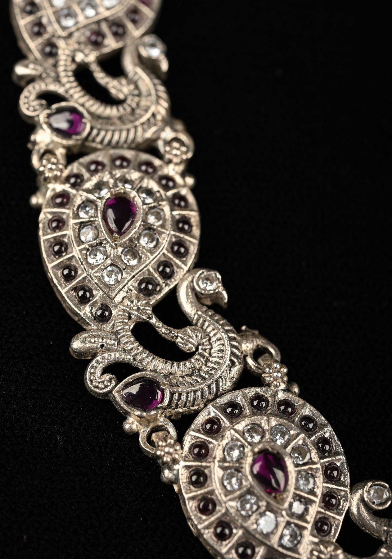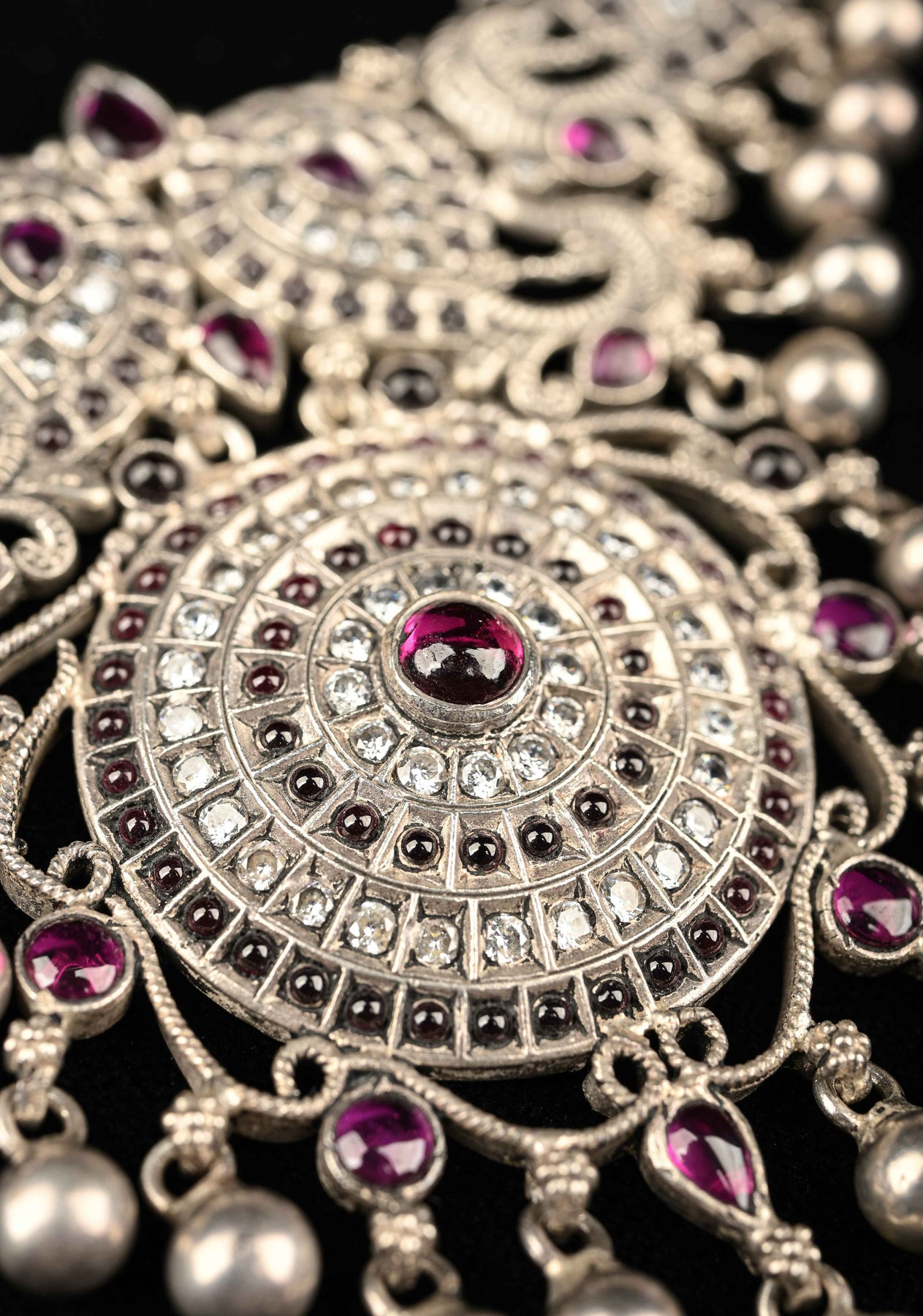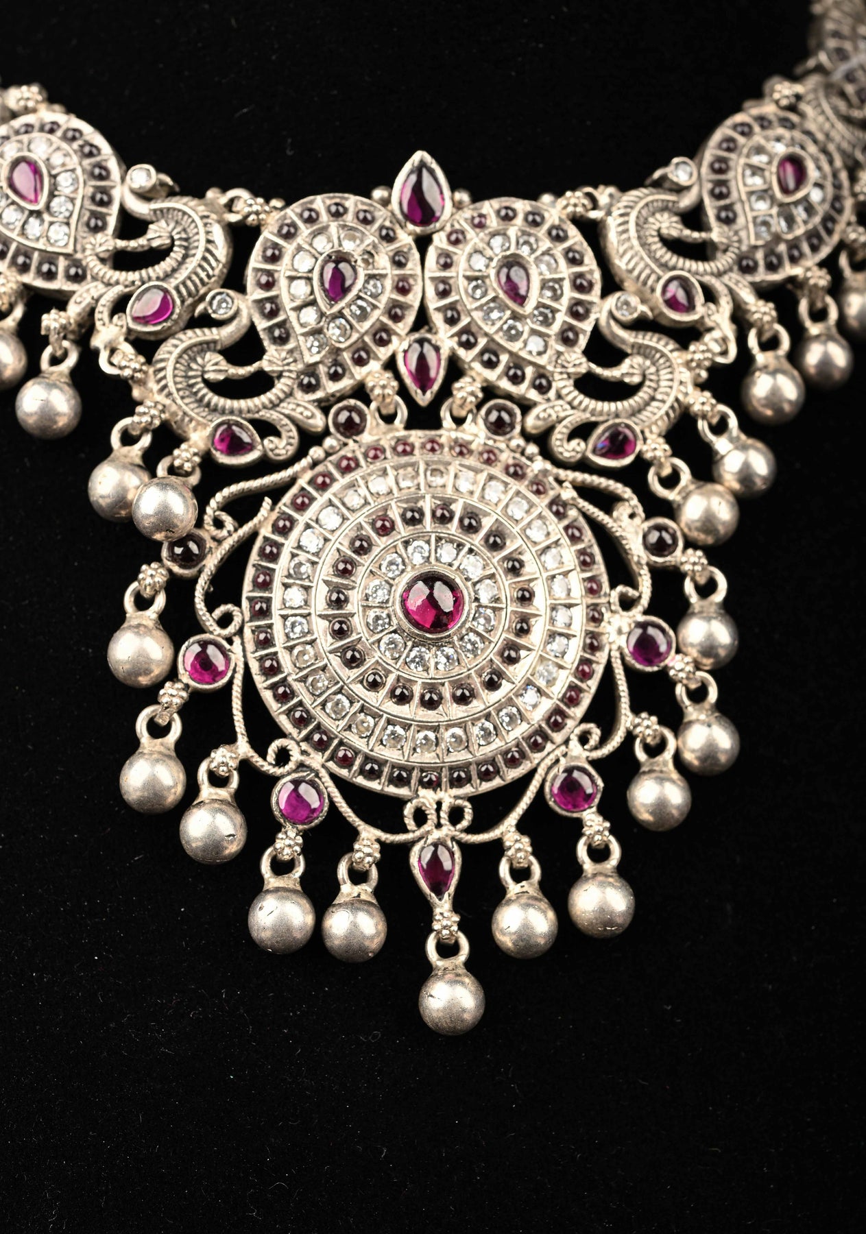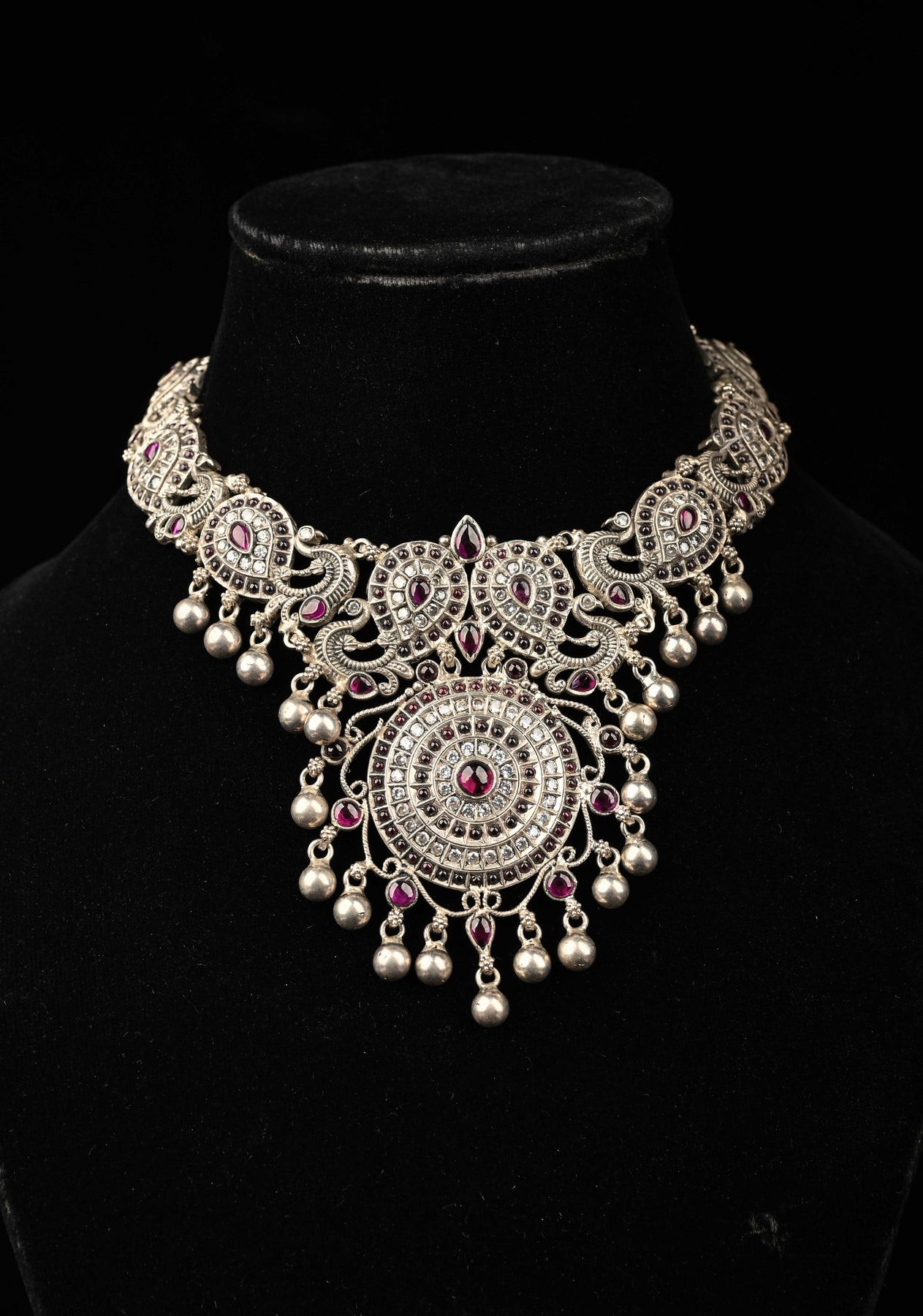 The 92.5 silver Rakshana oxidised necklace is a stunning piece that embodies strength and elegance through traditional design. Handcrafted from pure silver, it features a oxidised finish that highlights its intricate patterns and artisanal detailing. The name "Rakshana," meaning protection, reflects the necklace’s powerful presence and symbolic charm. Its versatile design makes it a perfect accessory for ethnic ensembles, temple jewelry styles, or statement fusion looks. yet durable, this necklace is ideal for adding a touch of heritage and grace to any occasion