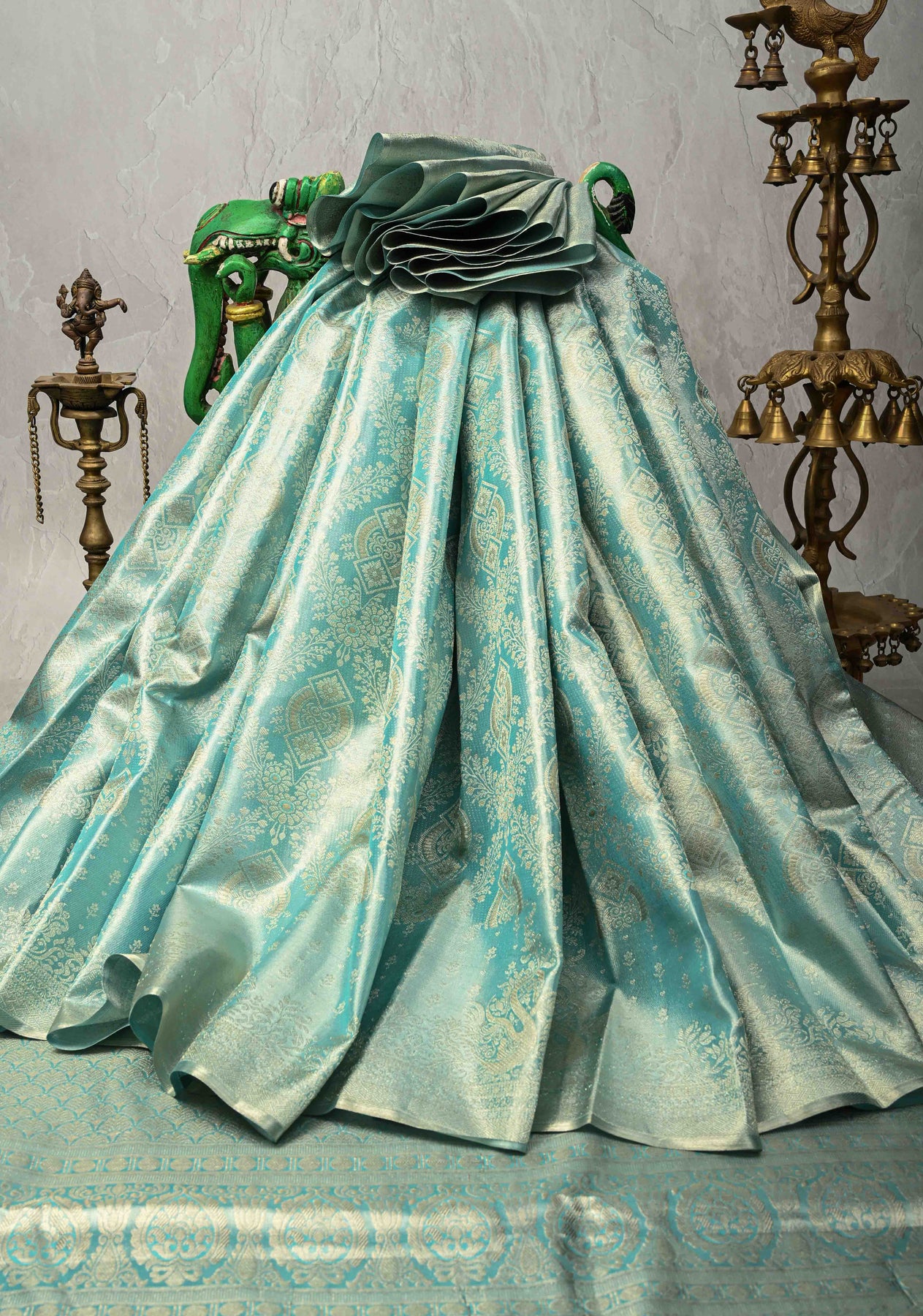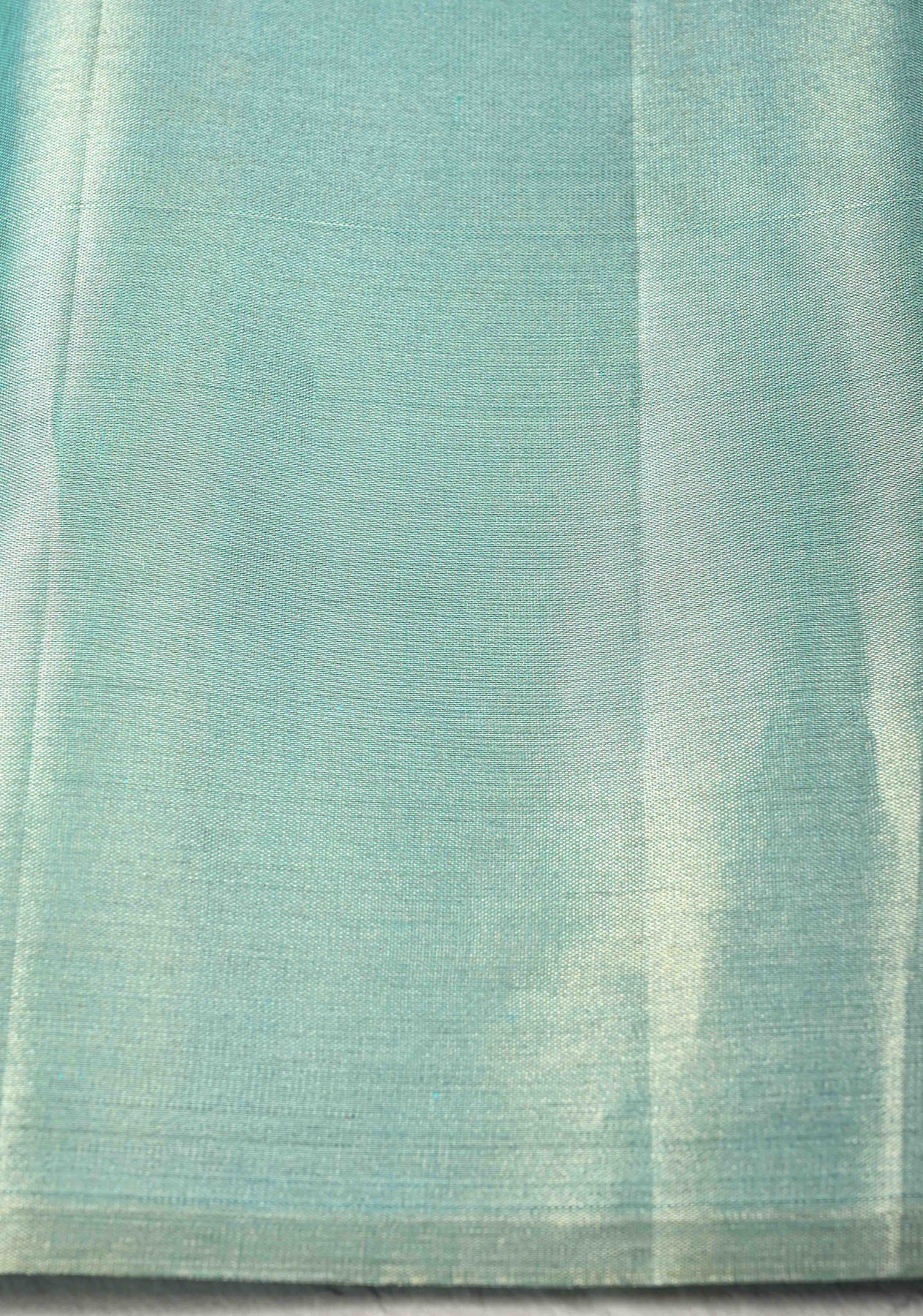 Step into elegance with this Aqua Blue Kanjivaram Pure Silk Tissue Saree, a stunning blend of delicate charm and rich tradition. Crafted from pure silk with a shimmering tissue finish, the saree features an intricate Meenakari brocade jaal that brings vibrant detail and artistic finesse to the serene aqua blue base. The shimmering zari border, adorned with classic motifs, adds a regal frame that enhances the saree’s grandeur. Perfect for weddings, festive occasions, and special events, this saree offers a graceful drape and a sophisticated silhouette. Pair it with traditional jewelry for a complete, royal look.