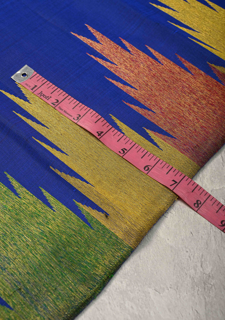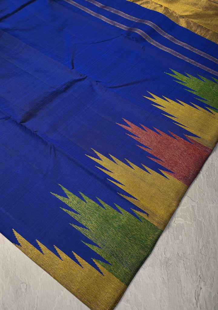 Traditional yet striking, this Authentic Kanjivaram Silk Saree in rich Sapphire Blue is a masterpiece of South Indian craftsmanship. The lustrous silk base is beautifully complemented by a vibrant multi-color temple border, featuring classic geometric patterns that symbolize heritage and cultural richness. The grand pallu is intricately woven with elaborate zari detailing, adding a regal finish that makes this saree a showstopper. Perfect for weddings, religious ceremonies, and grand festive occasions, this saree is a timeless symbol of elegance and tradition.