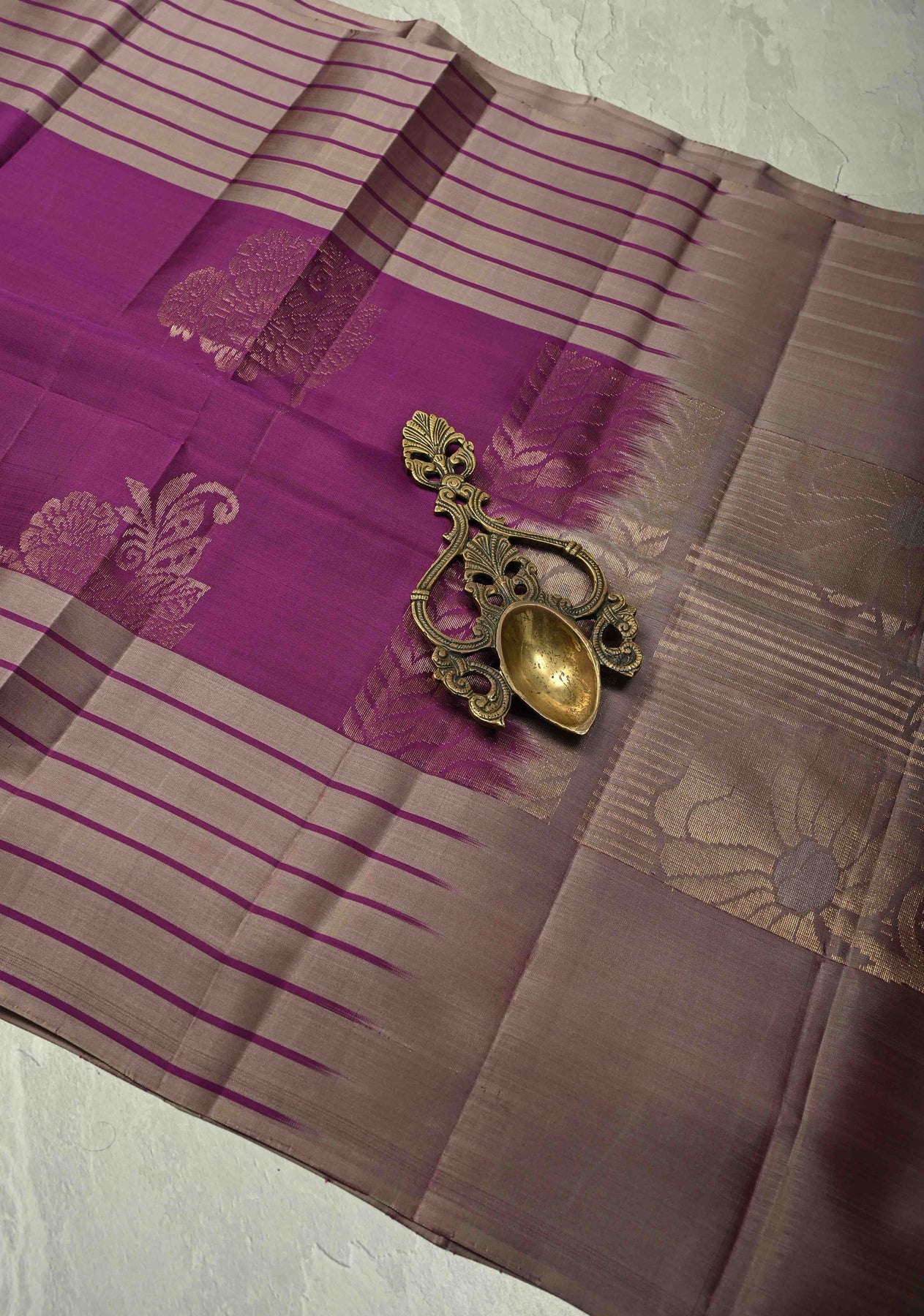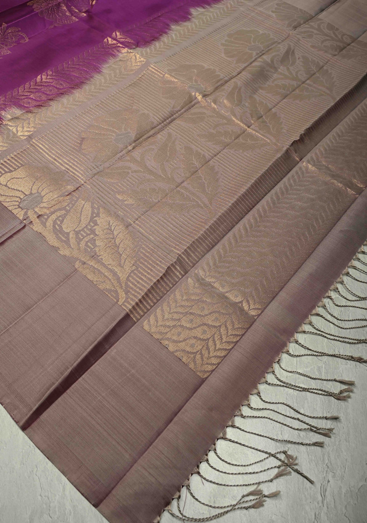 Indulge in classic South Indian elegance with this Plum Kanjivaram Soft Silk Saree. Woven from soft silk, the saree features a rich plum hue that exudes sophistication and grace. The body is adorned with delicate floral zari buttas, adding subtle sparkle and traditional charm. A beautifully crafted contrast border enhances the overall, creating a striking frame that elevates the drape. Lightweight, lustrous, and, this saree is perfect for weddings, festive occasions, and cultural celebrations—where timeless beauty meets flawless craftsmanship.