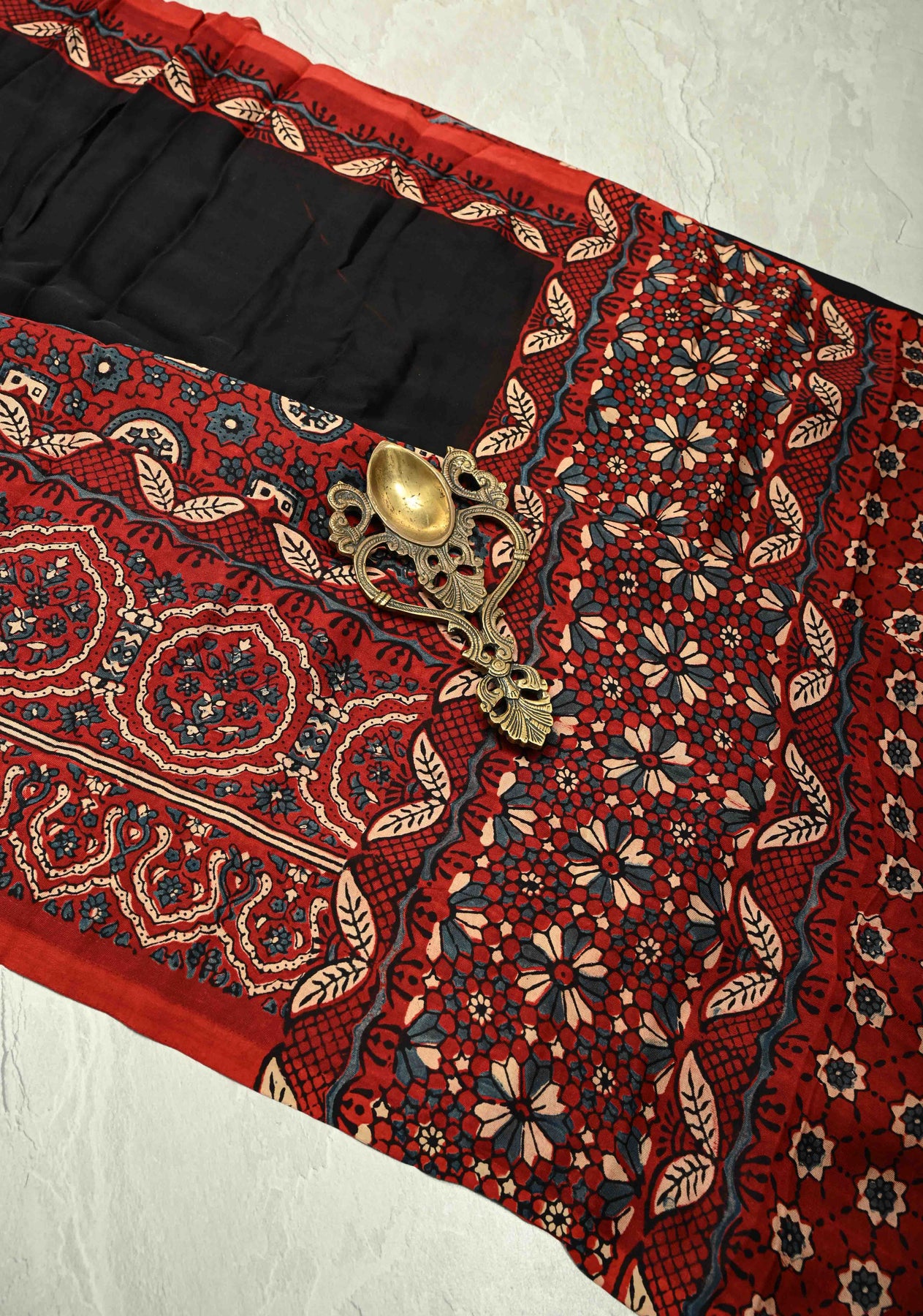 This elegant Black Modal Silk Saree combines contemporary style with traditional artistry. Crafted from soft, flowing modal silk, it offers a lightweight drape and a subtle sheen for effortless elegance. The saree features a striking Ajrakh hand block print on its wide border, showcasing intricate geometric and floral patterns inspired by classic Indian block printing techniques. The crushed pallu adds texture and modern appeal, creating a perfect balance between tradition and contemporary fashion. Ideal for casual gatherings, festive occasions, or cultural events, this saree is a versatile and stylish addition to any wardrobe.