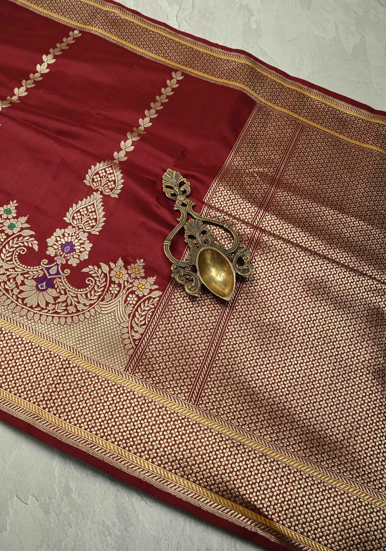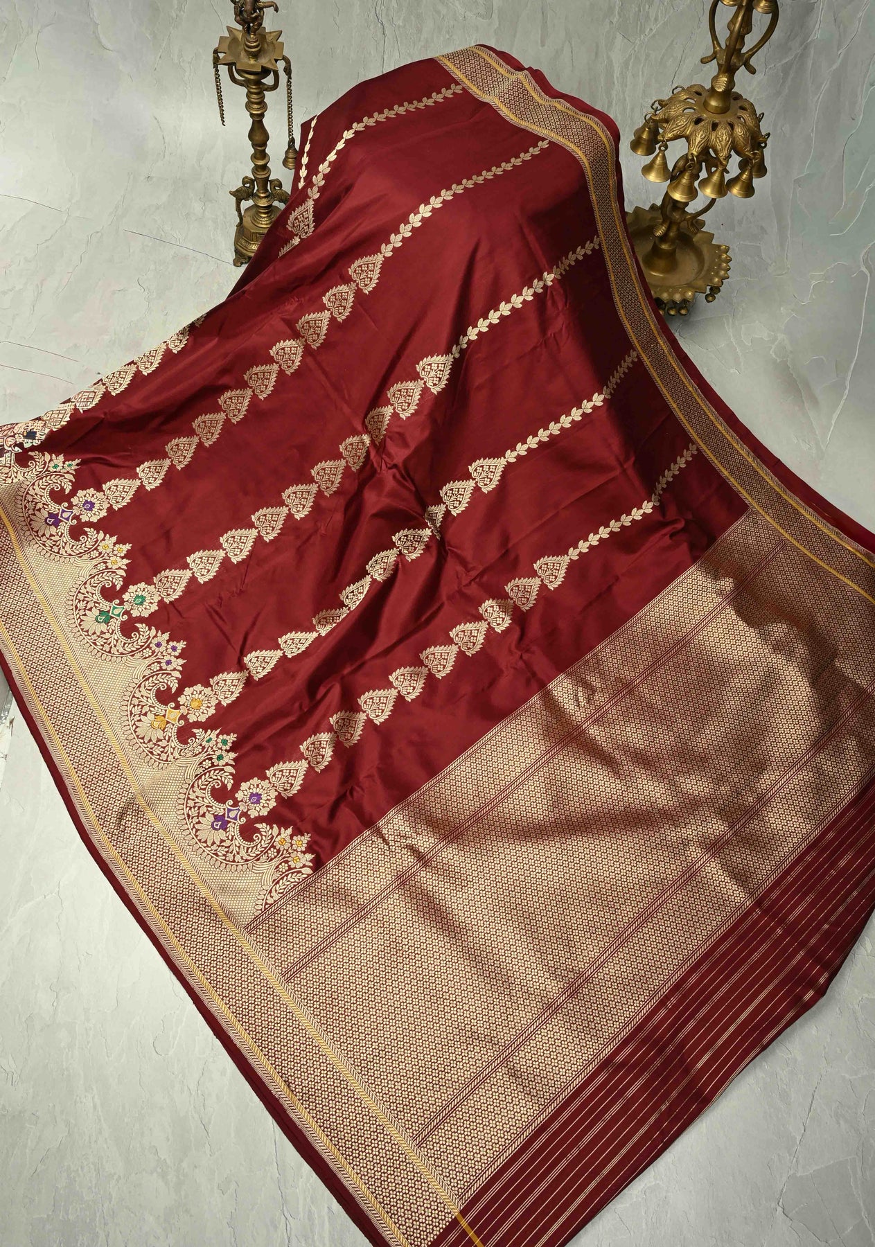 The Chocolate Brown Banarasi Pure Katan Silk Saree is a rich and regal ensemble that captures the essence of timeless Banarasi craftsmanship. Woven from pure Katan silk, the fabric boasts a luxurious sheen and a smooth, elegant drape. The chocolate brown hue adds a touch of understated sophistication, making it perfect for both day and evening events. The saree is adorned with intricate zari detailing throughout, offering a refined shimmer without overpowering its rich tone. What sets this piece apart is its exquisitely crafted Meenakari ornate scallop border, featuring colorful floral motifs highlighted in gold and silver threads. This saree is a true statement of grace, perfect for weddings, formal occasions, or adding a touch of grandeur to your collection.