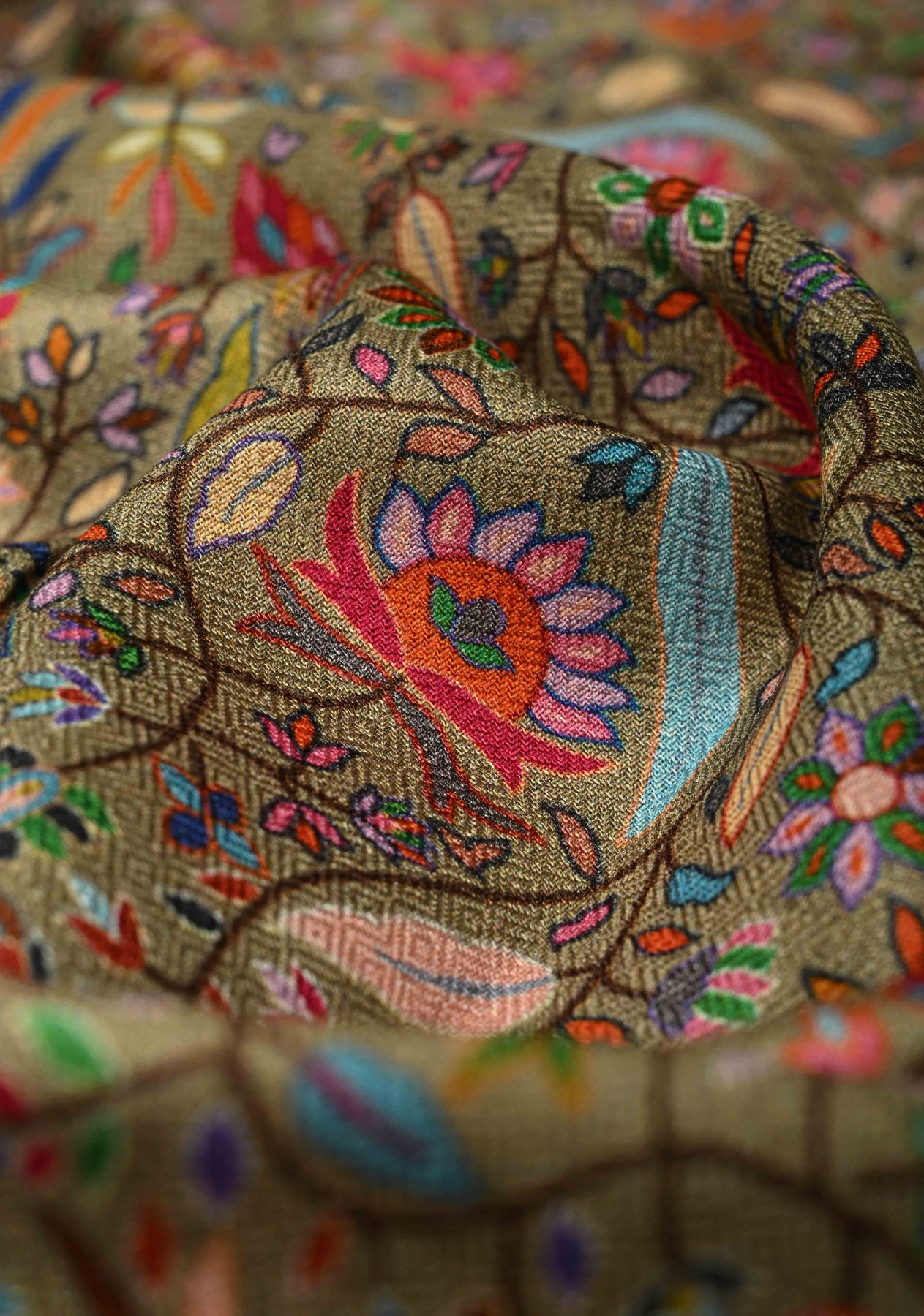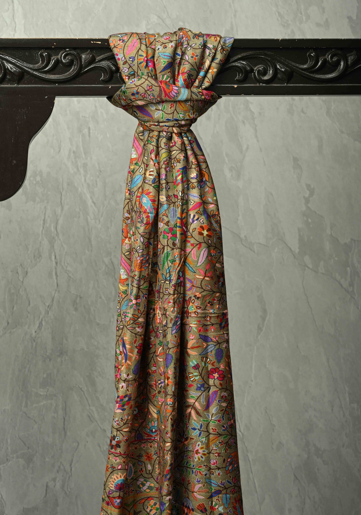 For Her: Dark Sage Green Floral Meenakari Jaal, A striking stole showcasing the intricate Meenakari Jaal weaving technique. Fine threads (meena) create detailed, shimmering floral patterns woven into a delicate, lattice-like jaal (net) framework